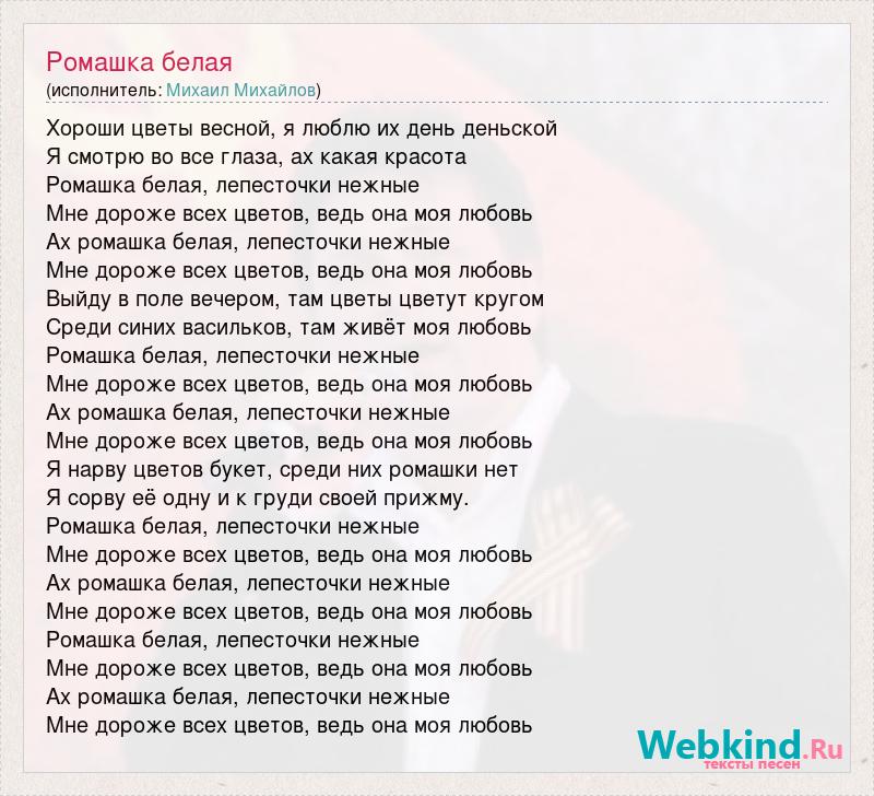 Хороши цветы весной, я люблю их день деньской Я смотрю во все глаза, ах какая красота Ромашка белая, лепесточки нежные Мне дороже всех цветов, ведь она моя любовь Ах ромашка белая, лепесточки нежные Мне дороже всех цветов, ведь она моя любовь Выйду в поле вечером, там цветы цветут кругом Среди синих васильков, там живёт моя любовь Ромашка белая, лепесточки нежные Мне дороже всех цветов, ведь она моя любовь Ах ромашка белая, лепесточки нежные Мне дороже всех цветов, ведь она моя любовь Я нарву цветов букет, среди них ромашки нет Я сорву её одну и к груди своей прижму. Ромашка белая, лепесточки нежные Мне дороже всех цветов, ведь она моя любовь Ах ромашка белая, лепесточки нежные Мне дороже всех цветов, ведь она моя любовь Ромашка белая, лепесточки нежные Мне дороже всех цветов, ведь она моя любовь Ах ромашка белая, лепесточки нежные Мне дороже всех цветов, ведь она моя любовь