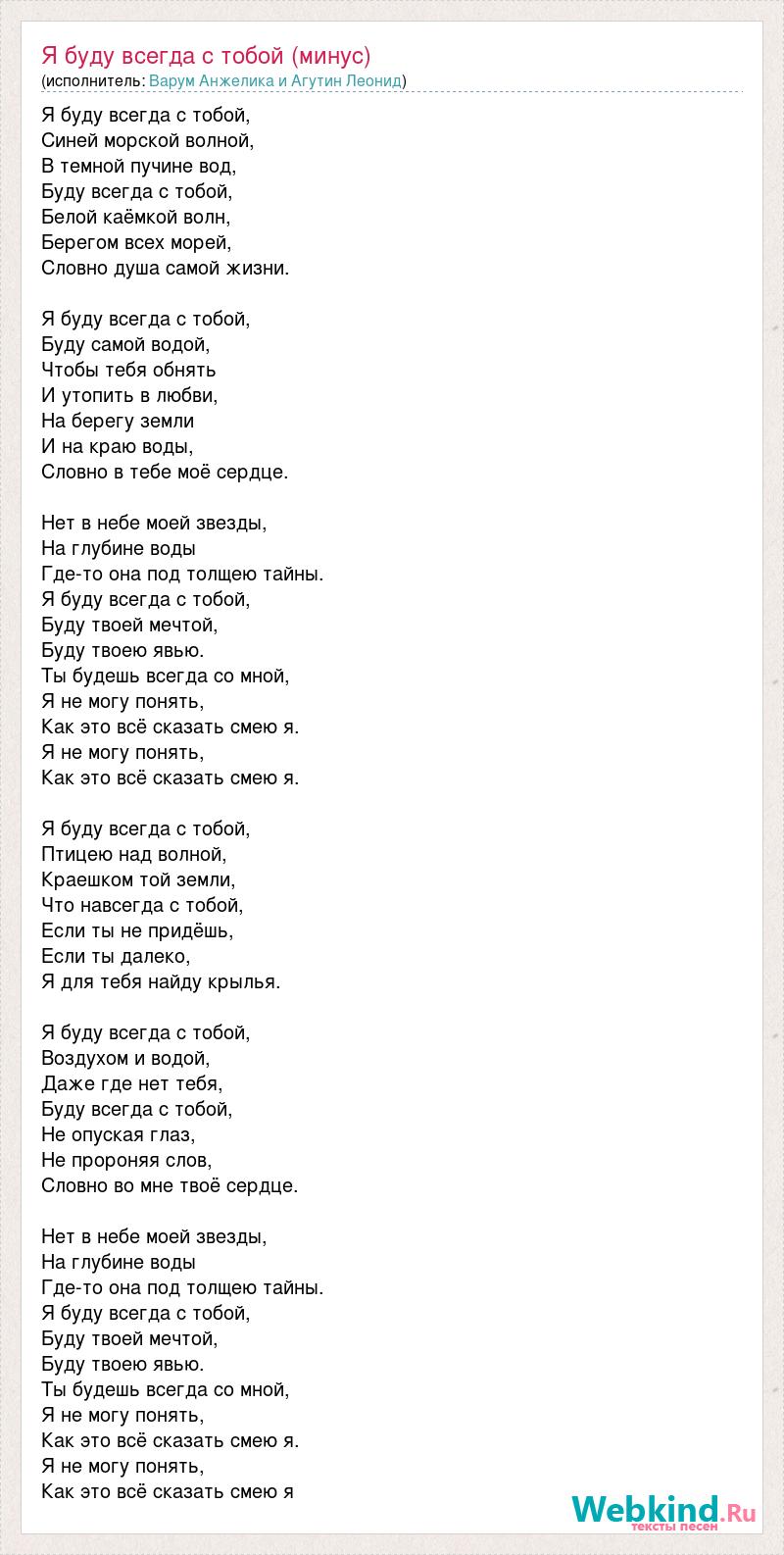 Я буду всегда с тобой, Синей морской волной, В темной пучине вод, Буду всегда с тобой, Белой каёмкой волн, Берегом всех морей, Словно душа самой жизни. Я буду всегда с тобой, Буду самой водой, Чтобы тебя обнять И утопить в любви, На берегу земли И на краю воды, Словно в тебе моё сердце. Нет в небе моей звезды, На глубине воды Где-то она под толщею тайны. Я буду всегда с тобой, Буду твоей мечтой, Буду твоею явью. Ты будешь всегда со мной, Я не могу понять, Как это всё сказать смею я. Я не могу понять, Как это всё сказать смею я. Я буду всегда с тобой, Птицею над волной, Краешком той земли, Что навсегда с тобой, Если ты не придёшь, Если ты далеко, Я для тебя найду крылья. Я буду всегда с тобой, Воздухом и водой, Даже где нет тебя, Буду всегда с тобой, Не опуская глаз, Не пророняя слов, Словно во мне твоё сердце. Нет в небе моей звезды, На глубине воды Где-то она под толщею тайны. Я буду всегда с тобой, Буду твоей мечтой, Буду твоею явью. Ты будешь всегда со мной, Я не могу понять, Как это всё сказать смею я. Я не могу понять, Как это всё сказать смею я