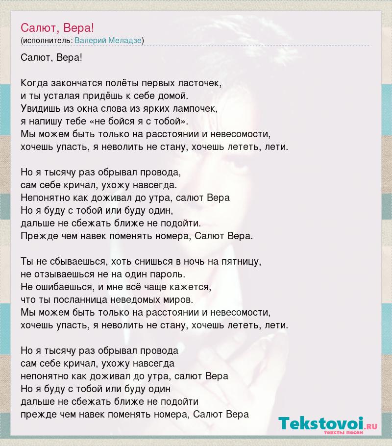 Салют, Вера! Когда закончатся полёты первых ласточек, и ты усталая придёшь к себе домой. Увидишь из окна слова из ярких лампочек, я напишу тебе «не бойся я с тобой». Мы можем быть только на расстоянии и невесомости, хочешь упасть, я неволить не стану, хочешь лететь, лети. Но я тысячу раз обрывал провода, сам себе кричал, ухожу навсегда. Непонятно как доживал до утра, салют Вера Но я буду с тобой или буду один, дальше не сбежать ближе не подойти. Прежде чем навек поменять номера, Салют Вера. Ты не сбываешься, хоть снишься в ночь на пятницу, не отзываешься не на один пароль. Не ошибаешься, и мне всё чаще кажется, что ты посланница неведомых миров. Мы можем быть только на расстоянии и невесомости, хочешь упасть, я неволить не стану, хочешь лететь, лети. Но я тысячу раз обрывал провода сам себе кричал, ухожу навсегда непонятно как доживал до утра, салют Вера Но я буду с тобой или буду один дальше не сбежать ближе не подойти прежде чем навек поменять номера, Салют Вера