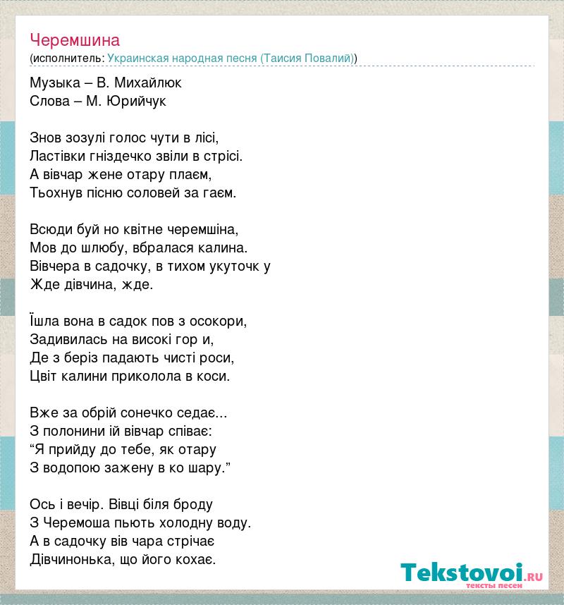 Музыка – В. Михайлюк Слова – М. Юрийчук Знов зозулi голос чути в лiсi, Ластiвки гнiздечко звiли в стрici. А вiвчар жене отару плаєм, Тьохнув пiсню соловей за гаєм. Всюди буй но квiтне черемшiна, Мов до шлюбу, вбралася калина. Вiвчера в садочку, в тихом укуточк у Жде дiвчина, жде. Їшла вона в садок пов з осокори, Задивилась на високi гор и, Де з берiз падають чистi роси, Цвiт калини приколола в коси. Вже за обрiй сонечко седає... З полонини iй вiвчар спiває: “Я прийду до тебе, як отару З водопою зажену в ко шару.” Ось i вечiр. Вiвцi бiля броду З Черемоша пьють холодну воду. А в садочку вiв чара стрiчає Дiвчинонька, що його кохає.