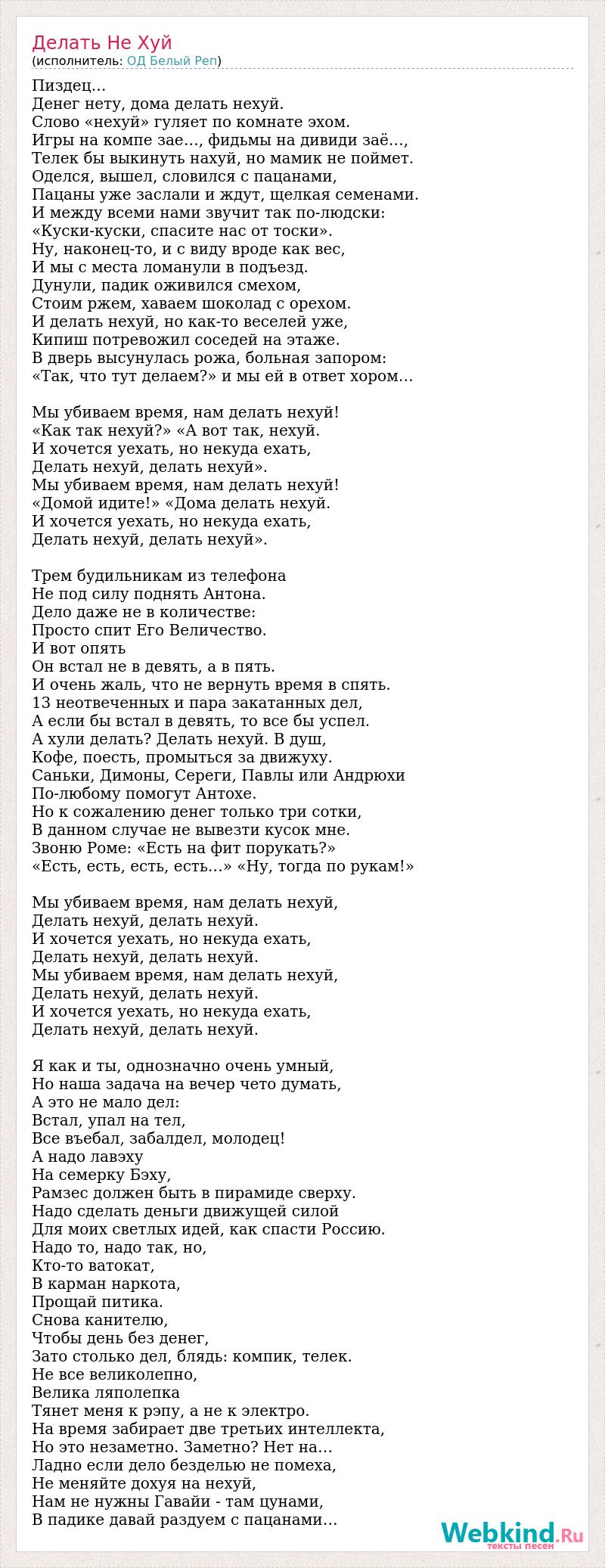 Пиздец… Денег нету, дома делать нехуй. Слово «нехуй» гуляет по комнате эхом. Игры на компе зае…, фидьмы на дивиди заё…, Телек бы выкинуть нахуй, но мамик не поймет. Оделся, вышел, словился с пацанами, Пацаны уже заслали и ждут, щелкая семенами. И между всеми нами звучит так по-людски: «Куски-куски, спасите нас от тоски». Ну, наконец-то, и с виду вроде как вес, И мы с места ломанули в подъезд. Дунули, падик оживился смехом, Стоим ржем, хаваем шоколад с орехом. И делать нехуй, но как-то веселей уже, Кипиш потревожил соседей на этаже. В дверь высунулась рожа, больная запором: «Так, что тут делаем?» и мы ей в ответ хором… Мы убиваем время, нам делать нехуй! «Как так нехуй?» «А вот так, нехуй. И хочется уехать, но некуда ехать, Делать нехуй, делать нехуй». Мы убиваем время, нам делать нехуй! «Домой идите!» «Дома делать нехуй. И хочется уехать, но некуда ехать, Делать нехуй, делать нехуй». Трем будильникам из телефона Не под силу поднять Антона. Дело даже не в количестве: Просто спит Его Величество. И вот опять Он встал не в девять, а в пять. И очень жаль, что не вернуть время в спять. 13 неотвеченных и пара закатанных дел, А если бы встал в девять, то все бы успел. А хули делать? Делать нехуй. В душ, Кофе, поесть, промыться за движуху. Саньки, Димоны, Сереги, Павлы или Андрюхи По-любому помогут Антохе. Но к сожалению денег только три сотки, В данном случае не вывезти кусок мне. Звоню Роме: «Есть на фит порукать?» «Есть, есть, есть, есть…» «Ну, тогда по рукам!» Мы убиваем время, нам делать нехуй, Делать нехуй, делать нехуй. И хочется уехать, но некуда ехать, Делать нехуй, делать нехуй. Мы убиваем время, нам делать нехуй, Делать нехуй, делать нехуй. И хочется уехать, но некуда ехать, Делать нехуй, делать нехуй. Я как и ты, однозначно очень умный, Но наша задача на вечер чето думать, А это не мало дел: Встал, упал на тел, Все въебал, забалдел, молодец! А надо лавэху На семерку Бэху, Рамзес должен быть в пирамиде сверху. Надо сделать деньги движущей силой Для моих светлых идей, как спасти Россию. Надо то, надо так, но, Кто-то ватокат, В карман наркота, Прощай питика. Снова канителю, Чтобы день без денег, Зато столько дел, блядь: компик, телек. Не все великолепно, Велика ляполепка Тянет меня к рэпу, а не к электро. На время забирает две третьих интеллекта, Но это незаметно. Заметно? Нет на… Ладно если дело безделью не помеха, Не меняйте дохуя на нехуй, Нам не нужны Гавайи - там цунами, В падике давай раздуем с пацанами…