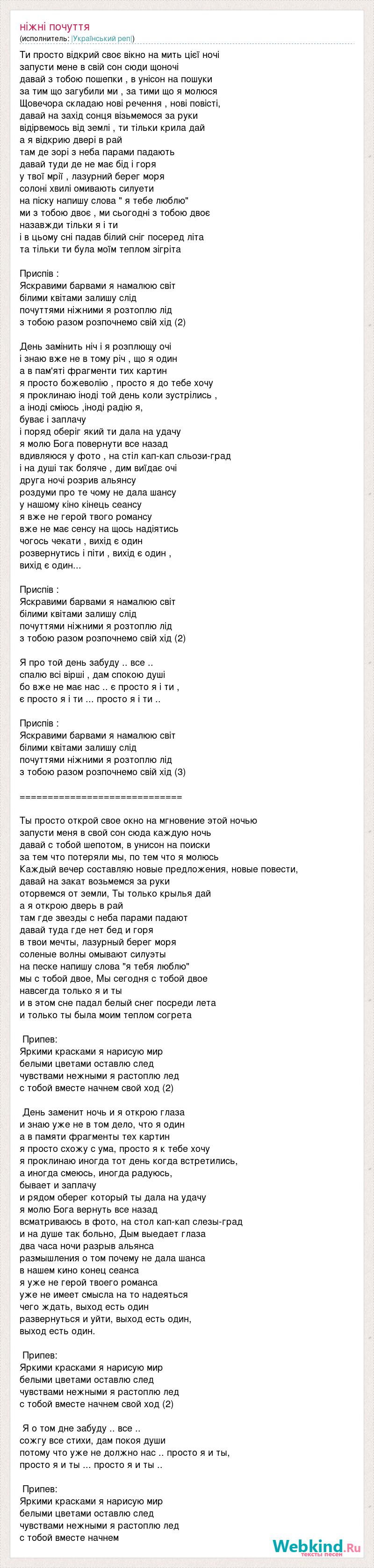 Ти просто відкрий своє вікно на мить цієї ночі запусти мене в свій сон сюди щоночі давай з тобою пошепки , в унісон на пошуки за тим що загубили ми , за тими що я молюся Щовечора складаю нові речення , нові повісті, давай на захід сонця візьмемося за руки відірвемось від землі , ти тільки крила дай а я відкрию двері в рай там де зорі з неба парами падають давай туди де не має бід і горя у твої мрії , лазурний берег моря солоні хвилі омивають силуети на піску напишу слова " я тебе люблю" ми з тобою двоє , ми сьогодні з тобою двоє назавжди тільки я і ти і в цьому сні падав білий сніг посеред літа та тільки ти була моїм теплом зігріта Приспів : Яскравими барвами я намалюю світ білими квітами залишу слід почуттями ніжними я розтоплю лід з тобою разом розпочнемо свій хід (2) День замінить ніч і я розплющу очі і знаю вже не в тому річ , що я один а в пам'яті фрагменти тих картин я просто божеволію , просто я до тебе хочу я проклинаю іноді той день коли зустрілись , а іноді сміюсь ,іноді радію я, буває і заплачу і поряд оберіг який ти дала на удачу я молю Бога повернути все назад вдивляюся у фото , на стіл кап-кап сльози-град і на душі так боляче , дим виїдає очі друга ночі розрив альянсу роздуми про те чому не дала шансу у нашому кіно кінець сеансу я вже не герой твого романсу вже не має сенсу на щось надіятись чогось чекати , вихід є один розвернутись і піти , вихід є один , вихід є один... Приспів : Яскравими барвами я намалюю світ білими квітами залишу слід почуттями ніжними я розтоплю лід з тобою разом розпочнемо свій хід (2) Я про той день забуду .. все .. спалю всі вірші , дам спокою душі бо вже не має нас .. є просто я і ти , є просто я і ти ... просто я і ти .. Приспів : Яскравими барвами я намалюю світ білими квітами залишу слід почуттями ніжними я розтоплю лід з тобою разом розпочнемо свій хід (3) ============================= Ты просто открой свое окно на мгновение этой ночью запусти меня в свой сон сюда каждую ночь давай с тобой шепотом, в унисон на поиски за тем что потеряли мы, по тем что я молюсь Каждый вечер составляю новые предложения, новые повести, давай на закат возьмемся за руки оторвемся от земли, Ты только крылья дай а я открою дверь в рай там где звезды с неба парами падают давай туда где нет бед и горя в твои мечты, лазурный берег моря соленые волны омывают силуэты на песке напишу слова "я тебя люблю" мы с тобой двое, Мы сегодня с тобой двое навсегда только я и ты и в этом сне падал белый снег посреди лета и только ты была моим теплом согрета Припев: Яркими красками я нарисую мир белыми цветами оставлю след чувствами нежными я растоплю лед с тобой вместе начнем свой ход (2) День заменит ночь и я открою глаза и знаю уже не в том дело, что я один а в памяти фрагменты тех картин я просто схожу с ума, просто я к тебе хочу я проклинаю иногда тот день когда встретились, а иногда смеюсь, иногда радуюсь, бывает и заплачу и рядом оберег который ты дала на удачу я молю Бога вернуть все назад всматриваюсь в фото, на стол кап-кап слезы-град и на душе так больно, Дым выедает глаза два часа ночи разрыв альянса размышления о том почему не дала шанса в нашем кино конец сеанса я уже не герой твоего романса уже не имеет смысла на то надеяться чего ждать, выход есть один развернуться и уйти, выход есть один, выход есть один. Припев: Яркими красками я нарисую мир белыми цветами оставлю след чувствами нежными я рас