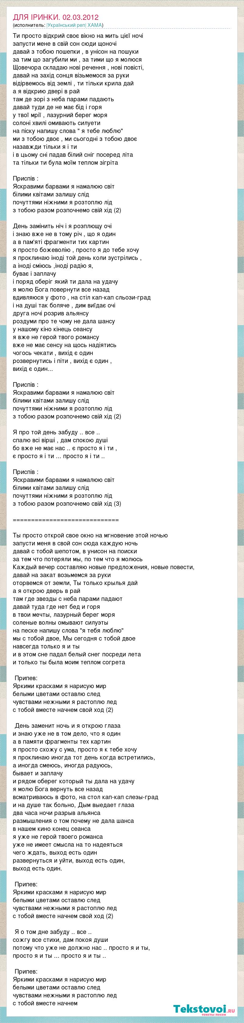Ти просто відкрий своє вікно на мить цієї ночі запусти мене в свій сон сюди щоночі давай з тобою пошепки , в унісон на пошуки за тим що загубили ми , за тими що я молюся Щовечора складаю нові речення , нові повісті, давай на захід сонця візьмемося за руки відірвемось від землі , ти тільки крила дай а я відкрию двері в рай там де зорі з неба парами падають давай туди де не має бід і горя у твої мрії , лазурний берег моря солоні хвилі омивають силуети на піску напишу слова " я тебе люблю" ми з тобою двоє , ми сьогодні з тобою двоє назавжди тільки я і ти і в цьому сні падав білий сніг посеред літа та тільки ти була моїм теплом зігріта Приспів : Яскравими барвами я намалюю світ білими квітами залишу слід почуттями ніжними я розтоплю лід з тобою разом розпочнемо свій хід (2) День замінить ніч і я розплющу очі і знаю вже не в тому річ , що я один а в пам'яті фрагменти тих картин я просто божеволію , просто я до тебе хочу я проклинаю іноді той день коли зустрілись , а іноді сміюсь ,іноді радію я, буває і заплачу і поряд оберіг який ти дала на удачу я молю Бога повернути все назад вдивляюся у фото , на стіл кап-кап сльози-град і на душі так боляче , дим виїдає очі друга ночі розрив альянсу роздуми про те чому не дала шансу у нашому кіно кінець сеансу я вже не герой твого романсу вже не має сенсу на щось надіятись чогось чекати , вихід є один розвернутись і піти , вихід є один , вихід є один... Приспів : Яскравими барвами я намалюю світ білими квітами залишу слід почуттями ніжними я розтоплю лід з тобою разом розпочнемо свій хід (2) Я про той день забуду .. все .. спалю всі вірші , дам спокою душі бо вже не має нас .. є просто я і ти , є просто я і ти ... просто я і ти .. Приспів : Яскравими барвами я намалюю світ білими квітами залишу слід почуттями ніжними я розтоплю лід з тобою разом розпочнемо свій хід (3) ============================= Ты просто открой свое окно на мгновение этой ночью запусти меня в свой сон сюда каждую ночь давай с тобой шепотом, в унисон на поиски за тем что потеряли мы, по тем что я молюсь Каждый вечер составляю новые предложения, новые повести, давай на закат возьмемся за руки оторвемся от земли, Ты только крылья дай а я открою дверь в рай там где звезды с неба парами падают давай туда где нет бед и горя в твои мечты, лазурный берег моря соленые волны омывают силуэты на песке напишу слова "я тебя люблю" мы с тобой двое, Мы сегодня с тобой двое навсегда только я и ты и в этом сне падал белый снег посреди лета и только ты была моим теплом согрета Припев: Яркими красками я нарисую мир белыми цветами оставлю след чувствами нежными я растоплю лед с тобой вместе начнем свой ход (2) День заменит ночь и я открою глаза и знаю уже не в том дело, что я один а в памяти фрагменты тех картин я просто схожу с ума, просто я к тебе хочу я проклинаю иногда тот день когда встретились, а иногда смеюсь, иногда радуюсь, бывает и заплачу и рядом оберег который ты дала на удачу я молю Бога вернуть все назад всматриваюсь в фото, на стол кап-кап слезы-град и на душе так больно, Дым выедает глаза два часа ночи разрыв альянса размышления о том почему не дала шанса в нашем кино конец сеанса я уже не герой твоего романса уже не имеет смысла на то надеяться чего ждать, выход есть один развернуться и уйти, выход есть один, выход есть один. Припев: Яркими красками я нарисую мир белыми цветами оставлю след чувствами нежными я рас