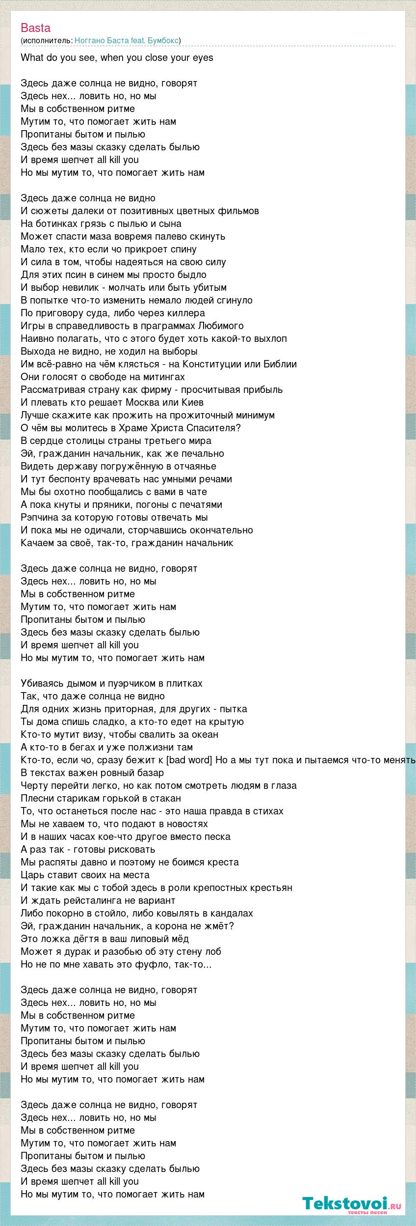 What do you see, when you close your eyes Здесь даже солнца не видно, говорят Здесь нех... ловить но, но мы Мы в собственном ритме Мутим то, что помогает жить нам Пропитаны бытом и пылью Здесь без мазы сказку сделать былью И время шепчет аll kill you Но мы мутим то, что помогает жить нам Здесь даже солнца не видно И сюжеты далеки от позитивных цветных фильмов На ботинках грязь с пылью и сына Может спасти маза вовремя палево скинуть Мало тех, кто если чо прикроет спину И сила в том, чтобы надеяться на свою силу Для этих псин в синем мы просто быдло И выбор невилик - молчать или быть убитым В попытке что-то изменить немало людей сгинуло По приговору суда, либо через киллера Игры в справедливость в праграммах Любимого Наивно полагать, что с этого будет хоть какой-то выхлоп Выхода не видно, не ходил на выборы Им всё-равно на чём клясться - на Конституции или Библии Они голосят о свободе на митингах Рассматривая страну как фирму - просчитывая прибыль И плевать кто решает Москва или Киев Лучше скажите как прожить на прожиточный минимум О чём вы молитесь в Храме Христа Спасителя? В сердце столицы страны третьего мира Эй, гражданин начальник, как же печально Видеть державу погружённую в отчаянье И тут беспонту врачевать нас умными речами Мы бы охотно пообщались с вами в чате А пока кнуты и пряники, погоны с печатями Рэпчина за которую готовы отвечать мы И пока мы не одичали, сторчавшись окончательно Качаем за своё, так-то, гражданин начальник Здесь даже солнца не видно, говорят Здесь нех... ловить но, но мы Мы в собственном ритме Мутим то, что помогает жить нам Пропитаны бытом и пылью Здесь без мазы сказку сделать былью И время шепчет аll kill you Но мы мутим то, что помогает жить нам Убиваясь дымом и пуэрчиком в плитках Так, что даже солнца не видно Для одних жизнь приторная, для других - пытка Ты дома спишь сладко, а кто-то едет на крытую Кто-то мутит визу, чтобы свалить за океан А кто-то в бегах и уже полжизни там Кто-то, если чо, сразу бежит к [bad word] Но а мы тут пока и пытаемся что-то менять В текстах важен ровный базар Черту перейти легко, но как потом смотреть людям в глаза Плесни старикам горькой в стакан То, что останеться после нас - это наша правда в стихах Мы не хаваем то, что подают в новостях И в наших часах кое-что другое вместо песка А раз так - готовы рисковать Мы распяты давно и поэтому не боимся креста Царь ставит своих на места И такие как мы с тобой здесь в роли крепостных крестьян И ждать рейсталинга не вариант Либо покорно в стойло, либо ковылять в кандалах Эй, гражданин начальник, а корона не жмёт? Это ложка дёгтя в ваш липовый мёд Может я дурак и разобью об эту стену лоб Но не по мне хавать это фуфло, так-то... Здесь даже солнца не видно, говорят Здесь нех... ловить но, но мы Мы в собственном ритме Мутим то, что помогает жить нам Пропитаны бытом и пылью Здесь без мазы сказку сделать былью И время шепчет аll kill you Но мы мутим то, что помогает жить нам Здесь даже солнца не видно, говорят Здесь нех... ловить но, но мы Мы в собственном ритме Мутим то, что помогает жить нам Пропитаны бытом и пылью Здесь без мазы сказку сделать былью И время шепчет аll kill you Но мы мутим то, что помогает жить нам