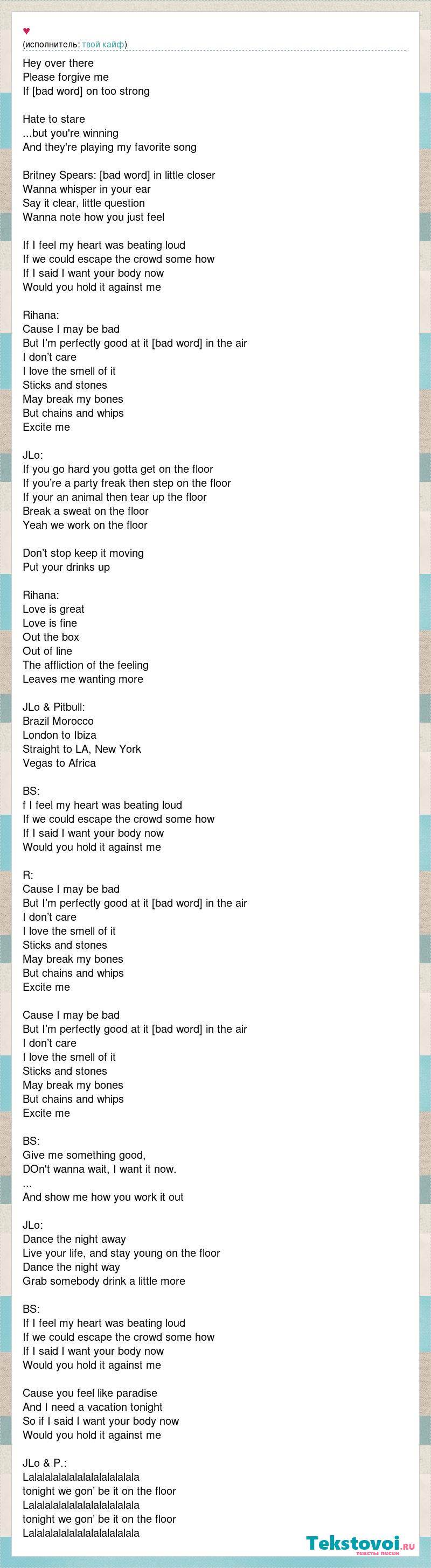 Hey over there Please forgive me If i'm coming on too strong Hate to stare ...but you're winning And they're playing my favorite song Britney Spears: So come in little closer Wanna whisper in your ear Say it clear, little question Wanna note how you just feel If I feel my heart was beating loud If we could escape the crowd some how If I said I want your body now Would you hold it against me Rihana: Cause I may be bad But I’m perfectly good at it [bad word] in the air I don’t care I love the smell of it Sticks and stones May break my bones But chains and whips Excite me JLo: If you go hard you gotta get on the floor If you’re a party freak then step on the floor If your an animal then tear up the floor Break a sweat on the floor Yeah we work on the floor Don’t stop keep it moving Put your drinks up Rihana: Love is great Love is fine Out the box Out of line The affliction of the feeling Leaves me wanting more JLo & Pitbull: Brazil Morocco London to Ibiza Straight to LA, New York Vegas to Africa BS: f I feel my heart was beating loud If we could escape the crowd some how If I said I want your body now Would you hold it against me R: Cause I may be bad But I’m perfectly good at it [bad word] in the air I don’t care I love the smell of it Sticks and stones May break my bones But chains and whips Excite me Cause I may be bad But I’m perfectly good at it [bad word] in the air I don’t care I love the smell of it Sticks and stones May break my bones But chains and whips Excite me BS: Give me something good, DOn't wanna wait, I want it now. ... And show me how you work it out JLo: Dance the night away Live your life, and stay young on the floor Dance the night way Grab somebody drink a little more BS: If I feel my heart was beating loud If we could escape the crowd some how If I said I want your body now Would you hold it against me Cause you feel like paradise And I need a vacation tonight So if I said I want your body now Would you hold it against me JLo & P.: Lalalalalalalalalalalalalala tonight we gon’ be it on the floor Lalalalalalalalalalalalalala tonight we gon’ be it on the floor Lalalalalalalalalalalalalala