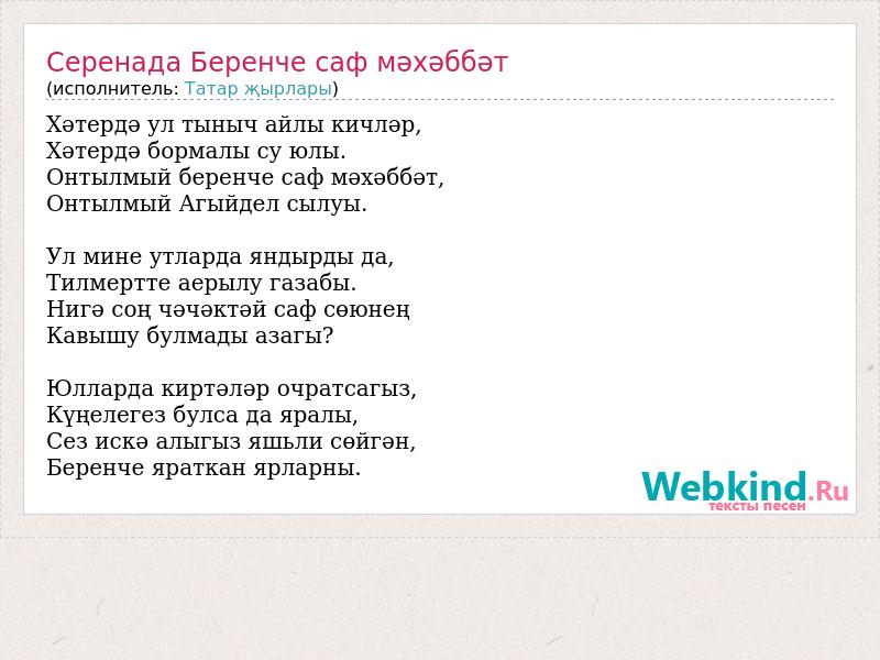 А как ты думаешь, о чем песня "Серенада Беренче саф мәхәббәт" ?