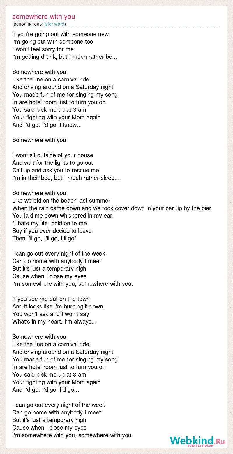 If you're going out with someone new I'm going out with someone too I won't feel sorry for me I'm getting drunk, but I much rather be... Somewhere with you Like the line on a carnival ride And driving around on a Saturday night You made fun of me for singing my song In are hotel room just to turn you on You said pick me up at 3 am Your fighting with your Mom again And I'd go. I'd go, I know... Somewhere with you I wont sit outside of your house And wait for the lights to go out Call up and ask you to rescue me I'm in their bed, but I much rather sleep... Somewhere with you Like we did on the beach last summer When the rain came down and we took cover down in your car up by the pier You laid me down whispered in my ear, "I hate my life, hold on to me Boy if you ever decide to leave Then I'll go, I'll go, I'll go" I can go out every night of the week Can go home with anybody I meet But it's just a temporary high Cause when I close my eyes I'm somewhere with you, somewhere with you. If you see me out on the town And it looks like I'm burning it down You won't ask and I won't say What's in my heart. I'm always... Somewhere with you Like the line on a carnival ride And driving around on a Saturday night You made fun of me for singing my song In are hotel room just to turn you on You said pick me up at 3 am Your fighting with your Mom again And I'd go, I'd go, I'd go... I can go out every night of the week Can go home with anybody I meet But it's just a temporary high Cause when I close my eyes I'm somewhere with you, somewhere with you.