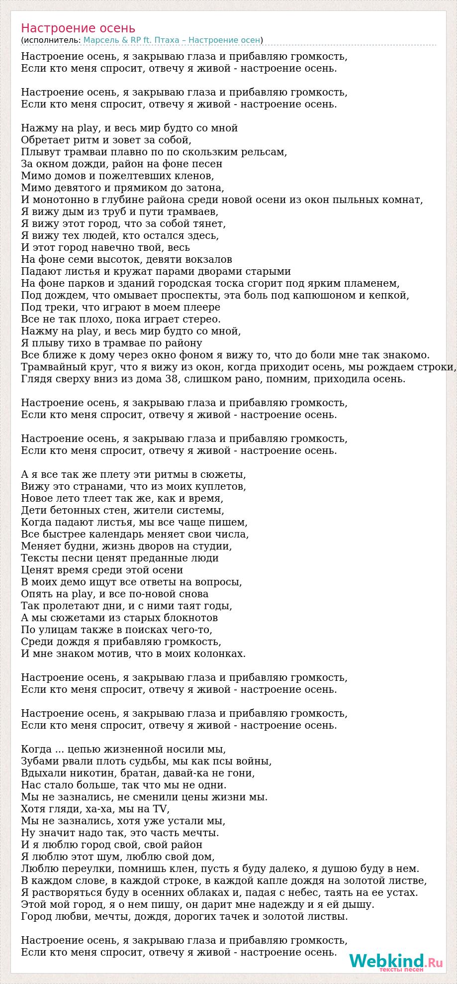 Настроение осень, я закрываю глаза и прибавляю громкость, Если кто меня спросит, отвечу я живой - настроение осень. Настроение осень, я закрываю глаза и прибавляю громкость, Если кто меня спросит, отвечу я живой - настроение осень. Нажму на play, и весь мир будто со мной Обретает ритм и зовет за собой, Плывут трамваи плавно по по скользким рельсам, За окном дожди, район на фоне песен Мимо домов и пожелтевших кленов, Мимо девятого и прямиком до затона, И монотонно в глубине района среди новой осени из окон пыльных комнат, Я вижу дым из труб и пути трамваев, Я вижу этот город, что за собой тянет, Я вижу тех людей, кто остался здесь, И этот город навечно твой, весь На фоне семи высоток, девяти вокзалов Падают листья и кружат парами дворами старыми На фоне парков и зданий городская тоска сгорит под ярким пламенем, Под дождем, что омывает проспекты, эта боль под капюшоном и кепкой, Под треки, что играют в моем плеере Все не так плохо, пока играет стерео. Нажму на play, и весь мир будто со мной, Я плыву тихо в трамвае по району Все ближе к дому через окно фоном я вижу то, что до боли мне так знакомо. Трамвайный круг, что я вижу из окон, когда приходит осень, мы рождаем строки, Глядя сверху вниз из дома 38, слишком рано, помним, приходила осень. Настроение осень, я закрываю глаза и прибавляю громкость, Если кто меня спросит, отвечу я живой - настроение осень. Настроение осень, я закрываю глаза и прибавляю громкость, Если кто меня спросит, отвечу я живой - настроение осень. А я все так же плету эти ритмы в сюжеты, Вижу это странами, что из моих куплетов, Новое лето тлеет так же, как и время, Дети бетонных стен, жители системы, Когда падают листья, мы все чаще пишем, Все быстрее календарь меняет свои числа, Меняет будни, жизнь дворов на студии, Тексты песни ценят преданные люди Ценят время среди этой осени В моих демо ищут все ответы на вопросы, Опять на play, и все по-новой снова Так пролетают дни, и с ними таят годы, А мы сюжетами из старых блокнотов По улицам также в поисках чего-то, Среди дождя я прибавляю громкость, И мне знаком мотив, что в моих колонках. Настроение осень, я закрываю глаза и прибавляю громкость, Если кто меня спросит, отвечу я живой - настроение осень. Настроение осень, я закрываю глаза и прибавляю громкость, Если кто меня спросит, отвечу я живой - настроение осень. Когда ... цепью жизненной носили мы, Зубами рвали плоть судьбы, мы как псы войны, Вдыхали никотин, братан, давай-ка не гони, Нас стало больше, так что мы не одни. Мы не зазнались, не сменили цены жизни мы. Хотя гляди, ха-ха, мы на TV, Мы не зазнались, хотя уже устали мы, Ну значит надо так, это часть мечты. И я люблю город свой, свой район Я люблю этот шум, люблю свой дом, Люблю переулки, помнишь клен, пусть я буду далеко, я душою буду в нем. В каждом слове, в каждой строке, в каждой капле дождя на золотой листве, Я растворяться буду в осенних облаках и, падая с небес, таять на ее устах. Этой мой город, я о нем пишу, он дарит мне надежду и я ей дышу. Город любви, мечты, дождя, дорогих тачек и золотой листвы. Настроение осень, я закрываю глаза и прибавляю громкость, Если кто меня спросит, отвечу я живой - настроение осень.