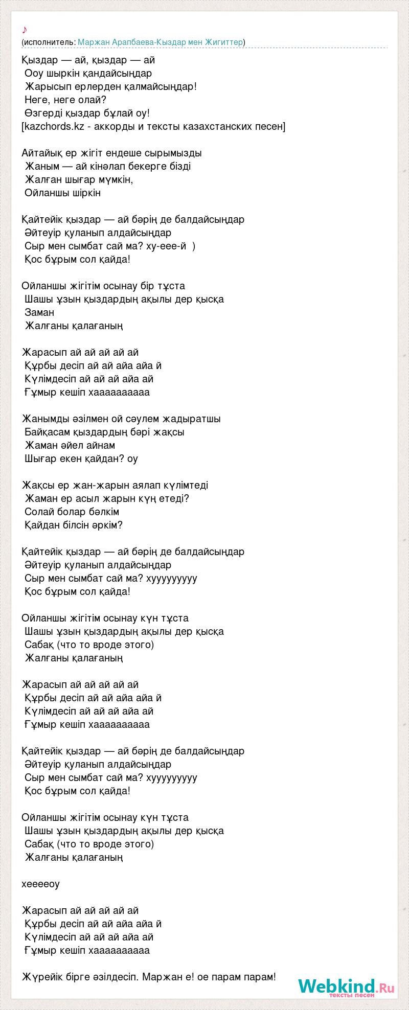 Қыздар — ай, қыздар — ай Ооу шыркін қандайсыңдар Жарысып ерлерден қалмайсыңдар! Неге, неге олай? Өзгерді қыздар бұлай оу! [kazchords.kz - аккорды и тексты казахстанских песен] Айтайық ер жігіт ендеше сырымызды Жаным — ай кінәлап бекерге бізді Жалған шығар мүмкін, Ойланшы шіркін Қайтейік қыздар — ай бәрің де балдайсыңдар Әйтеуір қуланып алдайсыңдар Сыр мен сымбат сай ма? ху-еее-й ) Қос бұрым сол қайда! Ойланшы жігітім осынау бір тұста Шашы ұзын қыздардың ақылы дер қысқа Заман Жалғаны қалағаның Жарасып ай ай ай ай ай Құрбы десіп ай ай айа айа й Күлімдесіп ай ай ай айа ай Ғұмыр кешіп хаааааааааа Жанымды әзілмен ой сәулем жадыратшы Байқасам қыздардың бәрі жақсы Жаман әйел айнам Шығар екен қайдан? оу Жақсы ер жан-жарын аялап күлімтеді Жаман ер асыл жарын күң етеді? Солай болар бәлкім Қайдан білсін әркім? Қайтейік қыздар — ай бәрің де балдайсыңдар Әйтеуір қуланып алдайсыңдар Сыр мен сымбат сай ма? хууууууууу Қос бұрым сол қайда! Ойланшы жігітім осынау күн тұста Шашы ұзын қыздардың ақылы дер қысқа Сабақ (что то вроде этого) Жалғаны қалағаның Жарасып ай ай ай ай ай Құрбы десіп ай ай айа айа й Күлімдесіп ай ай ай айа ай Ғұмыр кешіп хаааааааааа Қайтейік қыздар — ай бәрің де балдайсыңдар Әйтеуір қуланып алдайсыңдар Сыр мен сымбат сай ма? хууууууууу Қос бұрым сол қайда! Ойланшы жігітім осынау күн тұста Шашы ұзын қыздардың ақылы дер қысқа Сабақ (что то вроде этого) Жалғаны қалағаның хееееоу Жарасып ай ай ай ай ай Құрбы десіп ай ай айа айа й Күлімдесіп ай ай ай айа ай Ғұмыр кешіп хаааааааааа Жүрейік бірге әзілдесіп. Маржан е! ое парам парам!