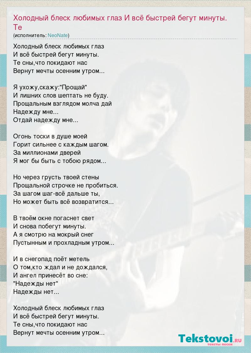 Холодный блеск любимых глаз И всё быстрей бегут минуты. Те сны,что покидают нас Вернут мечты осенним утром... Я ухожу,скажу:"Прощай" И лишних слов шептать не буду. Прощальным взглядом молча дай Надежду мне... Отдай надежду мне... Огонь тоски в душе моей Горит сильнее с каждым шагом. За миллионами дверей Я мог бы быть с тобою рядом... Но через грусть твоей стены Прощальной строчке не пробиться. За шагом шаг-всё дальше ты, Но может быть всё возвратится... В твоём окне погаснет свет И снова побегут минуты. А я смотрю на мокрый снег Пустынным и прохладным утром... И в снегопад поёт метель О том,кто ждал и не дождался, И ангел принесёт во сне: "Надежды нет" Надежды нет... Холодный блеск любимых глаз И всё быстрей бегут минуты. Те сны,что покидают нас Вернут мечты осенним утром...