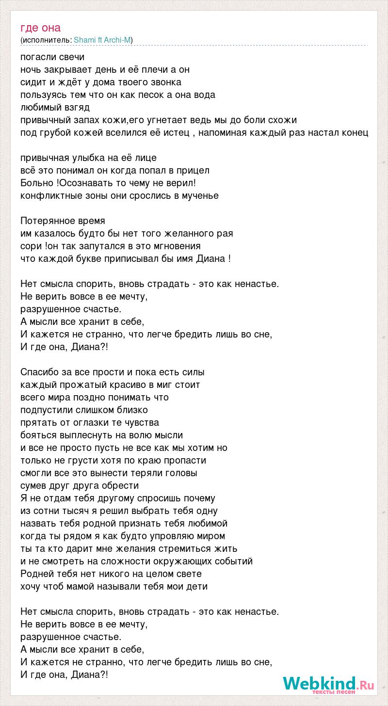 погасли свечи ночь закрывает день и её плечи а он сидит и ждёт у дома твоего звонка пользуясь тем что он как песок а она вода любимый взгяд привычный запах кожи,его угнетает ведь мы до боли схожи под грубой кожей вселился её истец , напоминая каждый раз настал конец привычная улыбка на её лице всё это понимал он когда попал в прицел Больно !Осознавать то чему не верил! конфликтные зоны они срослись в мученье Потерянное время им казалось будто бы нет того желанного рая сори !он так запутался в это мгновения что каждой букве приписывал бы имя Диана ! Нет смысла спорить, вновь страдать - это как ненастье. Не верить вовсе в ее мечту, разрушенное счастье. А мысли все хранит в себе, И кажется не странно, что легче бредить лишь во сне, И где она, Диана?! Спасибо за все прости и пока есть силы каждый прожатый красиво в миг стоит всего мира поздно понимать что подпустили слишком близко прятать от оглазки те чувства бояться выплеснуть на волю мысли и все не просто пусть не все как мы хотим но только не грусти хотя по краю пропасти смогли все это вынести теряли головы сумев друг друга обрести Я не отдам тебя другому спросишь почему из сотни тысяч я решил выбрать тебя одну назвать тебя родной признать тебя любимой когда ты рядом я как будто упровляю миром ты та кто дарит мне желания стремиться жить и не смотреть на сложности окружающих событий Родней тебя нет никого на целом свете хочу чтоб мамой называли тебя мои дети Нет смысла спорить, вновь страдать - это как ненастье. Не верить вовсе в ее мечту, разрушенное счастье. А мысли все хранит в себе, И кажется не странно, что легче бредить лишь во сне, И где она, Диана?!