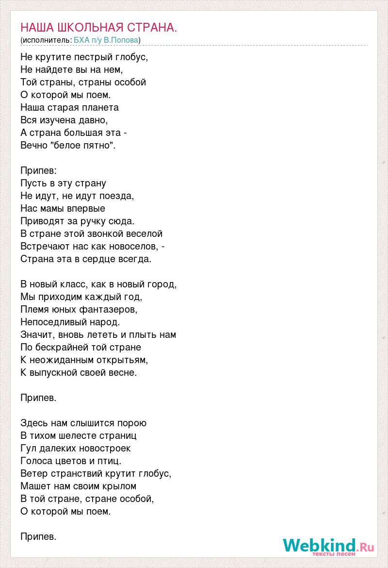 Не крутите пестрый глобус, Не найдете вы на нем, Той страны, страны особой О которой мы поем. Наша старая планета Вся изучена давно, А страна большая эта - Вечно "белое пятно". Припев: Пусть в эту страну Не идут, не идут поезда, Нас мамы впервые Приводят за ручку сюда. В стране этой звонкой веселой Встречают нас как новоселов, - Страна эта в сердце всегда. В новый класс, как в новый город, Мы приходим каждый год, Племя юных фантазеров, Непоседливый народ. Значит, вновь лететь и плыть нам По бескрайней той стране К неожиданным открытьям, К выпускной своей весне. Припев. Здесь нам слышится порою В тихом шелесте страниц Гул далеких новостроек Голоса цветов и птиц. Ветер странствий крутит глобус, Машет нам своим крылом В той стране, стране особой, О которой мы поем. Припев.
