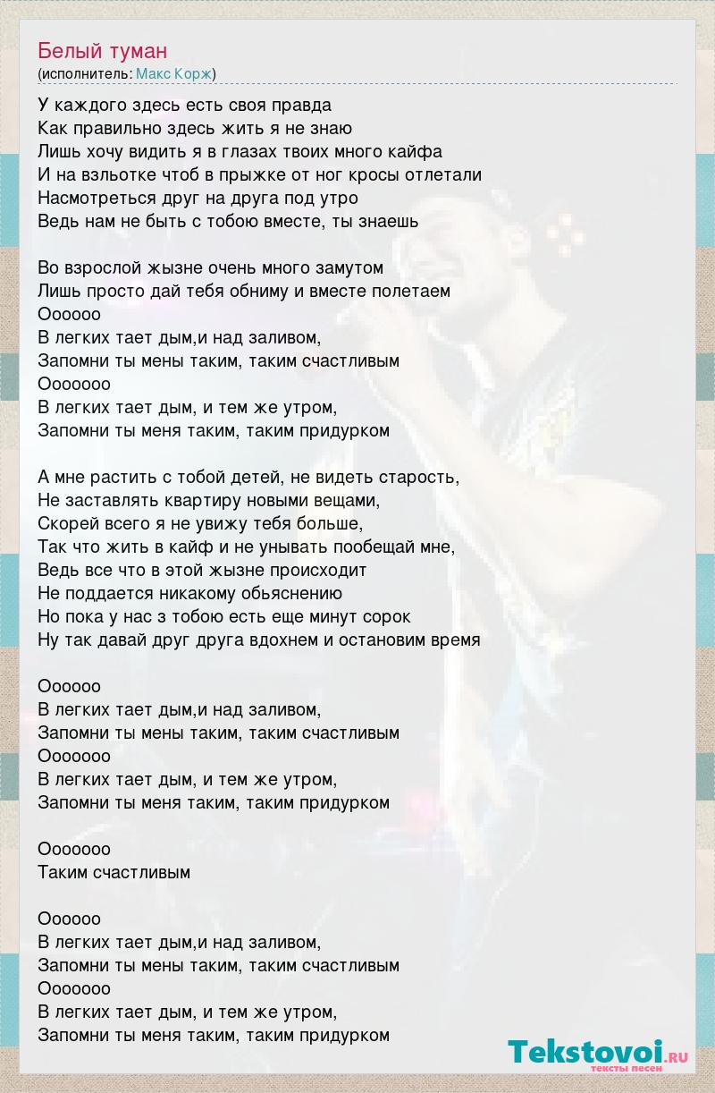 У каждого здесь есть своя правда Как правильно здесь жить я не знаю Лишь хочу видить я в глазах твоих много кайфа И на взльотке чтоб в прыжке от ног кросы отлетали Насмотреться друг на друга под утро Ведь нам не быть с тобою вместе, ты знаешь Во взрослой жызне очень много замутом Лишь просто дай тебя обниму и вместе полетаем Оооооо В легких тает дым,и над заливом, Запомни ты мены таким, таким счастливым Ооооооо В легких тает дым, и тем же утром, Запомни ты меня таким, таким придурком А мне растить с тобой детей, не видеть старость, Не заставлять квартиру новыми вещами, Скорей всего я не увижу тебя больше, Так что жить в кайф и не унывать пообещай мне, Ведь все что в этой жызне происходит Не поддается никакому обьяснению Но пока у нас з тобою есть еще минут сорок Ну так давай друг друга вдохнем и остановим время Оооооо В легких тает дым,и над заливом, Запомни ты мены таким, таким счастливым Ооооооо В легких тает дым, и тем же утром, Запомни ты меня таким, таким придурком Ооооооо Таким счастливым Оооооо В легких тает дым,и над заливом, Запомни ты мены таким, таким счастливым Ооооооо В легких тает дым, и тем же утром, Запомни ты меня таким, таким придурком