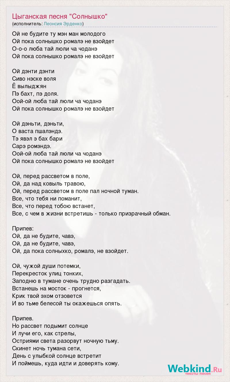 Ой не будите ту мэн ман молодого Ой пока солнышко ромалэ не взойдет О-о-о люба тай люли ча чоданэ Ой пока солнышко ромалэ не взойдет Ой дэнти дэнти Сиво нэске воля Ё вылыджян Пэ бахт, пэ доля. Оой-ой люба тай люли ча чоданэ Ой пока солнышко ромалэ не взойдет Ой дэньти, дэньти, О васта пшалэндэ. Тэ явэл э бах бари Сарэ ромэндэ. Оой-ой люба тай люли ча чоданэ Ой пока солнышко ромалэ не взойдет Ой, перед рассветом в поле, Ой, да над ковыль травою, Ой, перед рассветом в поле пал ночной туман. Все, что тебя ни поманит, Все, что перед тобою встанет, Все, с чем в жизни встретишь - только призрачный обман. Припев: Ой, да не будите, чавэ, Ой, да не будите, чавэ, Ой, да пока солныхко, ромалэ, не взойдет. Ой, чужой души потемки, Перекресток улиц тонких, Заподню в тумане очень трудно разгадать. Встанешь на мосток - прогнется, Крик твой эхом отзовется И во тьме белесой ты окажешься опять. Припев. Но рассвет подымит солнце И лучи его, как стрелы, Остриями света разорвут ночную тьму. Скинет ночь тумана сети, День с улыбкой солнце встретит И поймешь, куда идти и доверять кому.