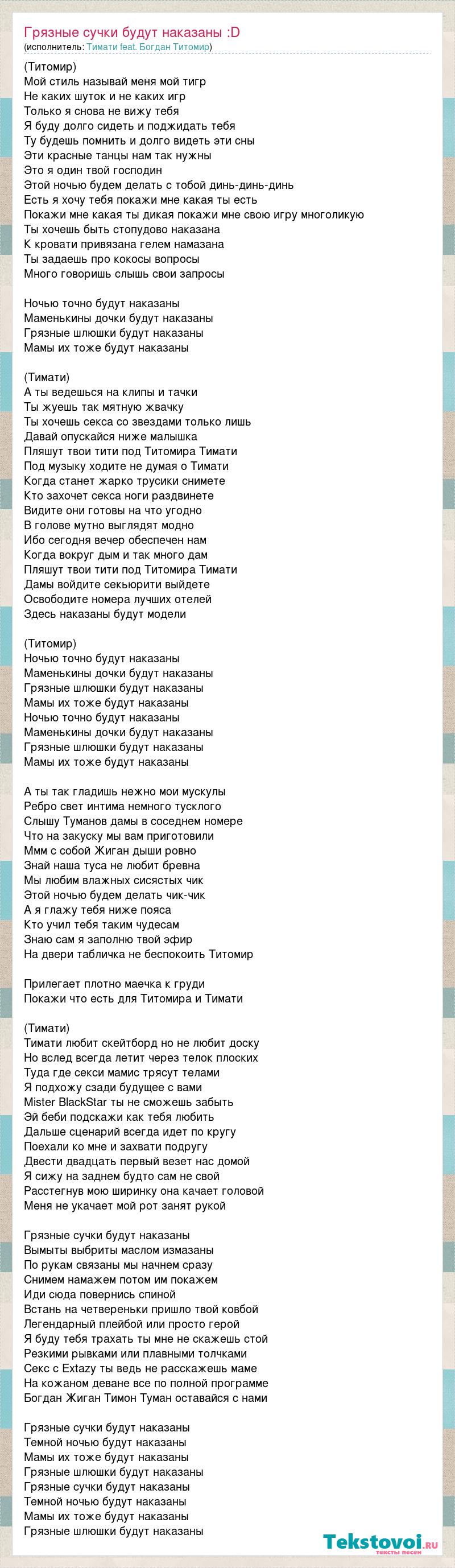 (Титомир) Мой стиль называй меня мой тигр Не каких шуток и не каких игр Только я снова не вижу тебя Я буду долго сидеть и поджидать тебя Ту будешь помнить и долго видеть эти сны Эти красные танцы нам так нужны Это я один твой господин Этой ночью будем делать с тобой динь-динь-динь Есть я хочу тебя покажи мне какая ты есть Покажи мне какая ты дикая покажи мне свою игру многоликую Ты хочешь быть стопудово наказана К кровати привязана гелем намазана Ты задаешь про кокосы вопросы Много говоришь слышь свои запросы Ночью точно будут наказаны Маменькины дочки будут наказаны Грязные шлюшки будут наказаны Мамы их тоже будут наказаны (Тимати) А ты ведешься на клипы и тачки Ты жуешь так мятную жвачку Ты хочешь секса со звездами только лишь Давай опускайся ниже малышка Пляшут твои тити под Титомира Тимати Под музыку ходите не думая о Тимати Когда станет жарко трусики снимете Кто захочет секса ноги раздвинете Видите они готовы на что угодно В голове мутно выглядят модно Ибо сегодня вечер обеспечен нам Когда вокруг дым и так много дам Пляшут твои тити под Титомира Тимати Дамы войдите секьюрити выйдете Освободите номера лучших отелей Здесь наказаны будут модели (Титомир) Ночью точно будут наказаны Маменькины дочки будут наказаны Грязные шлюшки будут наказаны Мамы их тоже будут наказаны Ночью точно будут наказаны Маменькины дочки будут наказаны Грязные шлюшки будут наказаны Мамы их тоже будут наказаны А ты так гладишь нежно мои мускулы Ребро свет интима немного тусклого Слышу Туманов дамы в соседнем номере Что на закуску мы вам приготовили Ммм с собой Жиган дыши ровно Знай наша туса не любит бревна Мы любим влажных сисястых чик Этой ночью будем делать чик-чик А я глажу тебя ниже пояса Кто учил тебя таким чудесам Знаю сам я заполню твой эфир На двери табличка не беспокоить Титомир Прилегает плотно маечка к груди Покажи что есть для Титомира и Тимати (Тимати) Тимати любит скейтборд но не любит доску Но вслед всегда летит через телок плоских Туда где секси мамис трясут телами Я подхожу сзади будущее с вами Mister BlackStar ты не сможешь забыть Эй беби подскажи как тебя любить Дальше сценарий всегда идет по кругу Поехали ко мне и захвати подругу Двести двадцать первый везет нас домой Я сижу на заднем будто сам не свой Расстегнув мою ширинку она качает головой Меня не укачает мой рот занят рукой Грязные сучки будут наказаны Вымыты выбриты маслом измазаны По рукам связаны мы начнем сразу Снимем намажем потом им покажем Иди сюда повернись спиной Встань на четвереньки пришло твой ковбой Легендарный плейбой или просто герой Я буду тебя трахать ты мне не скажешь стой Резкими рывками или плавными толчками Секс с Extazy ты ведь не расскажешь маме На кожаном деване все по полной программе Богдан Жиган Тимон Туман оставайся с нами Грязные сучки будут наказаны Темной ночью будут наказаны Мамы их тоже будут наказаны Грязные шлюшки будут наказаны Грязные сучки будут наказаны Темной ночью будут наказаны Мамы их тоже будут наказаны Грязные шлюшки будут наказаны