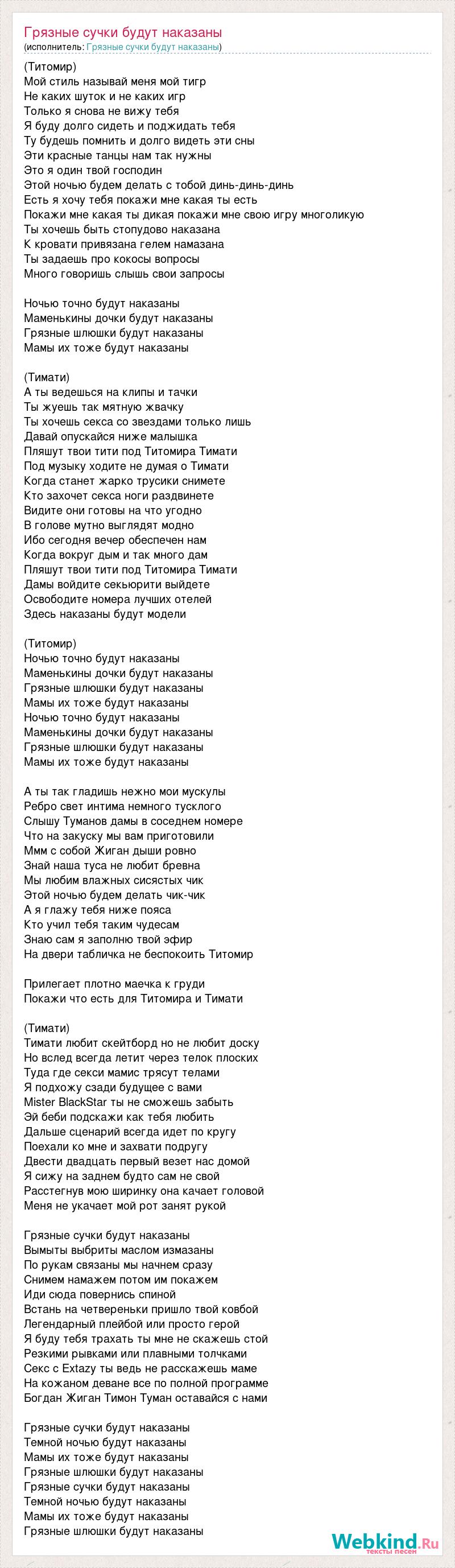 (Титомир) Мой стиль называй меня мой тигр Не каких шуток и не каких игр Только я снова не вижу тебя Я буду долго сидеть и поджидать тебя Ту будешь помнить и долго видеть эти сны Эти красные танцы нам так нужны Это я один твой господин Этой ночью будем делать с тобой динь-динь-динь Есть я хочу тебя покажи мне какая ты есть Покажи мне какая ты дикая покажи мне свою игру многоликую Ты хочешь быть стопудово наказана К кровати привязана гелем намазана Ты задаешь про кокосы вопросы Много говоришь слышь свои запросы Ночью точно будут наказаны Маменькины дочки будут наказаны Грязные шлюшки будут наказаны Мамы их тоже будут наказаны (Тимати) А ты ведешься на клипы и тачки Ты жуешь так мятную жвачку Ты хочешь секса со звездами только лишь Давай опускайся ниже малышка Пляшут твои тити под Титомира Тимати Под музыку ходите не думая о Тимати Когда станет жарко трусики снимете Кто захочет секса ноги раздвинете Видите они готовы на что угодно В голове мутно выглядят модно Ибо сегодня вечер обеспечен нам Когда вокруг дым и так много дам Пляшут твои тити под Титомира Тимати Дамы войдите секьюрити выйдете Освободите номера лучших отелей Здесь наказаны будут модели (Титомир) Ночью точно будут наказаны Маменькины дочки будут наказаны Грязные шлюшки будут наказаны Мамы их тоже будут наказаны Ночью точно будут наказаны Маменькины дочки будут наказаны Грязные шлюшки будут наказаны Мамы их тоже будут наказаны А ты так гладишь нежно мои мускулы Ребро свет интима немного тусклого Слышу Туманов дамы в соседнем номере Что на закуску мы вам приготовили Ммм с собой Жиган дыши ровно Знай наша туса не любит бревна Мы любим влажных сисястых чик Этой ночью будем делать чик-чик А я глажу тебя ниже пояса Кто учил тебя таким чудесам Знаю сам я заполню твой эфир На двери табличка не беспокоить Титомир Прилегает плотно маечка к груди Покажи что есть для Титомира и Тимати (Тимати) Тимати любит скейтборд но не любит доску Но вслед всегда летит через телок плоских Туда где секси мамис трясут телами Я подхожу сзади будущее с вами Mister BlackStar ты не сможешь забыть Эй беби подскажи как тебя любить Дальше сценарий всегда идет по кругу Поехали ко мне и захвати подругу Двести двадцать первый везет нас домой Я сижу на заднем будто сам не свой Расстегнув мою ширинку она качает головой Меня не укачает мой рот занят рукой Грязные сучки будут наказаны Вымыты выбриты маслом измазаны По рукам связаны мы начнем сразу Снимем намажем потом им покажем Иди сюда повернись спиной Встань на четвереньки пришло твой ковбой Легендарный плейбой или просто герой Я буду тебя трахать ты мне не скажешь стой Резкими рывками или плавными толчками Секс с Extazy ты ведь не расскажешь маме На кожаном деване все по полной программе Богдан Жиган Тимон Туман оставайся с нами Грязные сучки будут наказаны Темной ночью будут наказаны Мамы их тоже будут наказаны Грязные шлюшки будут наказаны Грязные сучки будут наказаны Темной ночью будут наказаны Мамы их тоже будут наказаны Грязные шлюшки будут наказаны