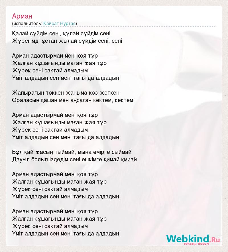 Қалай сүйдім сені, құлай сүйдім сені Жүрегімді ұстап жылай сүйдім сені, сені Арман адастырмай мені қоя тұр Жалған құшағынды маған жая тұр Жүрек сені сақтай алмадым Үміт алдадың сен мені тағы да алдадың Жапырағын төккен жаныма көз жеткен Ораласың қашан мен аңсаған көктем, көктем Арман адастырмай мені қоя тұр Жалған құшағынды маған жая тұр Жүрек сені сақтай алмадым Үміт алдадың сен мені тағы да алдадың Бұл қай жасың тыймай, мына өмірге сыймай Дауыл болып іздедім сені ешкімге қимай қмиай Арман адастырмай мені қоя тұр Жалған құшағынды маған жая тұр Жүрек сені сақтай алмадым Үміт алдадың сен мені тағы да алдадың Арман адастырмай мені қоя тұр Жалған құшағынды маған жая тұр Жүрек сені сақтай алмадым Үміт алдадың сен мені тағы да алдадың