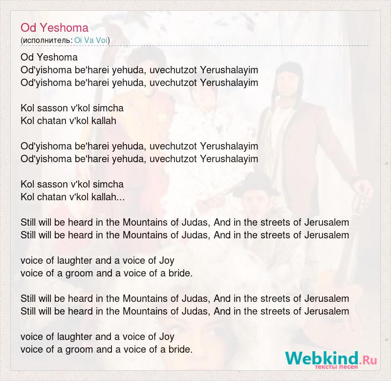 Od Yeshoma Od'yishoma be'harei yehuda, uvechutzot Yerushalayim Od'yishoma be'harei yehuda, uvechutzot Yerushalayim Kol sasson v'kol simcha Kol chatan v'kol kallah Od'yishoma be'harei yehuda, uvechutzot Yerushalayim Od'yishoma be'harei yehuda, uvechutzot Yerushalayim Kol sasson v'kol simcha Kol chatan v'kol kallah... Still will be heard in the Mountains of Judas, And in the streets of Jerusalem Still will be heard in the Mountains of Judas, And in the streets of Jerusalem voice of laughter and a voice of Joy voice of a groom and a voice of a bride. Still will be heard in the Mountains of Judas, And in the streets of Jerusalem Still will be heard in the Mountains of Judas, And in the streets of Jerusalem voice of laughter and a voice of Joy voice of a groom and a voice of a bride.