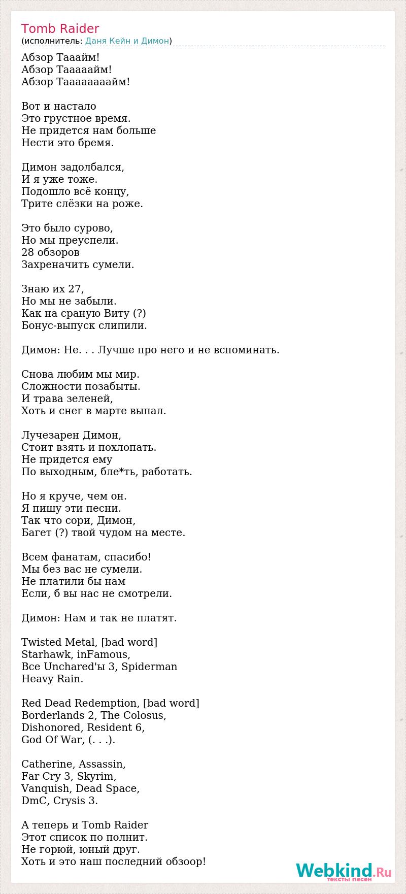 Абзор Тааайм! Абзор Тааааайм! Абзор Таааааааайм! Вот и настало Это грустное время. Не придется нам больше Нести это бремя. Димон задолбался, И я уже тоже. Подошло всё концу, Трите слёзки на роже. Это было сурово, Но мы преуспели. 28 обзоров Захреначить сумели. Знаю их 27, Но мы не забыли. Как на сраную Виту (?) Бонус-выпуск слипили. Димон: Не. . . Лучше про него и не вспоминать. Снова любим мы мир. Сложности позабыты. И трава зеленей, Хоть и снег в марте выпал. Лучезарен Димон, Стоит взять и похлопать. Не придется ему По выходным, бле*ть, работать. Но я круче, чем он. Я пишу эти песни. Так что сори, Димон, Багет (?) твой чудом на месте. Всем фанатам, спасибо! Мы без вас не сумели. Не платили бы нам Если, б вы нас не смотрели. Димон: Нам и так не платят. Twisted Metal, [bad word] Starhawk, inFamous, Все Unchared'ы 3, Spiderman Heavy Rain. Red Dead Redemption, [bad word] Borderlands 2, The Colosus, Dishonored, Resident 6, God Of War, (. . .). Catherine, Assassin, Far Cry 3, Skyrim, Vanquish, Dead Space, DmC, Crysis 3. А теперь и Tomb Raider Этот список по полнит. Не горюй, юный друг. Хоть и это наш последний обзоор!