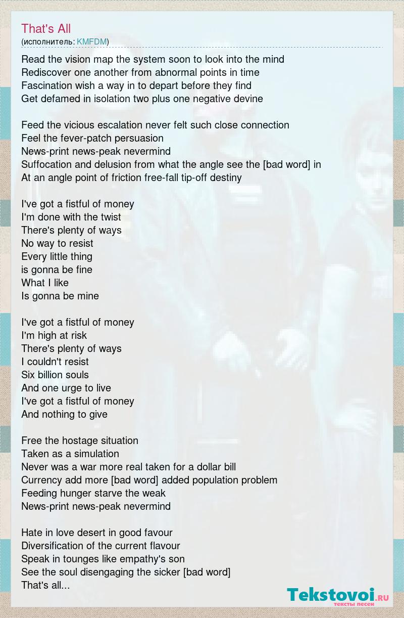 Read the vision map the system soon to look into the mind Rediscover one another from abnormal points in time Fascination wish a way in to depart before they find Get defamed in isolation two plus one negative devine Feed the vicious escalation never felt such close connection Feel the fever-patch persuasion News-print news-peak nevermind Suffocation and delusion from what the angle see the truth in At an angle point of friction free-fall tip-off destiny I've got a fistful of money I'm done with the twist There's plenty of ways No way to resist Every little thing is gonna be fine What I like Is gonna be mine I've got a fistful of money I'm high at risk There's plenty of ways I couldn't resist Six billion souls And one urge to live I've got a fistful of money And nothing to give Free the hostage situation Taken as a simulation Never was a war more real taken for a dollar bill Currency add more corruption added population problem Feeding hunger starve the weak News-print news-peak nevermind Hate in love desert in good favour Diversification of the current flavour Speak in tounges like empathy's son See the soul disengaging the sicker they come That's all...