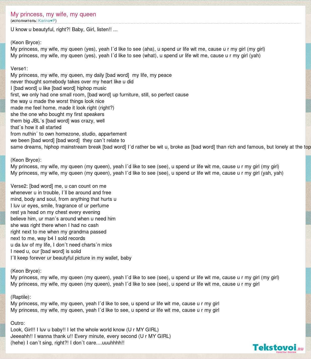 U know u beautyful, right?! Baby, Girl, listen!! ... (Keon Bryce): My princess, my wife, my queen (yes), yeah I´d like to see (aha), u spend ur life wit me, cause u r my girl (my girl) My princess, my wife, my queen (yes), yeah I´d like to see (what), u spend ur life wit me, cause u r my girl (yah) Verse1: My princess, my wife, my queen, my daily struggle, my life, my peace never thought somebody takes over my heart like u did I trust u like true hiphop music first, we only had one small room, [bad word] up furniture, still, so perfect cause the way u made the worst things look nice made me feel home, made it look right (right?) she the one who bought my first speakers them big JBL´s [bad word] was crazy, well that´s how it all started from nuthin´ to own homezone, studio, appartement we been thru [bad word] they can´t relate to same dreams, hiphop mainstream break thru I´d rather be wit u, broke as [bad word] than rich and famous, but lonely at the top (Keon Bryce): My princess, my wife, my queen (my queen), yeah I´d like to see (see), u spend ur life wit me, cause u r my girl (my girl) My princess, my wife, my queen (my queen), yeah I´d like to see (see), u spend ur life wit me, cause u r my girl (yah, yah) Verse2: Trust me, u can count on me whenever u in trouble, I´ll be around and free mind, body and soul, from anything that hurts u I luv ur eyes, smile, fragrance of ur perfume rest ya head on my chest every evening believe him, ur man´s around when u need him she was right there when I had no cash right next to me when my grandma passed next to me, way b4 I sold records u da luv of my life, I don´t need charts´n mics I need u, our [bad word] is solid I´ll keep forever ur beautyful picture in my wallet, baby (Keon Bryce): My princess, my wife, my queen (my queen), yeah I´d like to see (see), u spend ur life wit me, cause u r my girl (my girl) My princess, my wife, my queen (my queen), yeah I´d like to see (see), u spend ur life wit me, cause u r my girl (Raptile): My princess, my wife, my queen, yeah I´d like to see, u spend ur life wit me, cause u r my girl My princess, my wife, my queen, yeah I´d like to see, u spend ur life wit me, cause u r my girl Outro: Look, Girl!! I luv u baby!! I let the whole world know (U r MY GIRL) Jeeeahh!! I wanna thank u!! Every minute, every second (U r MY GIRL) (hehe) I can´t sing, right?! I don´t care....uuuhhhh!!