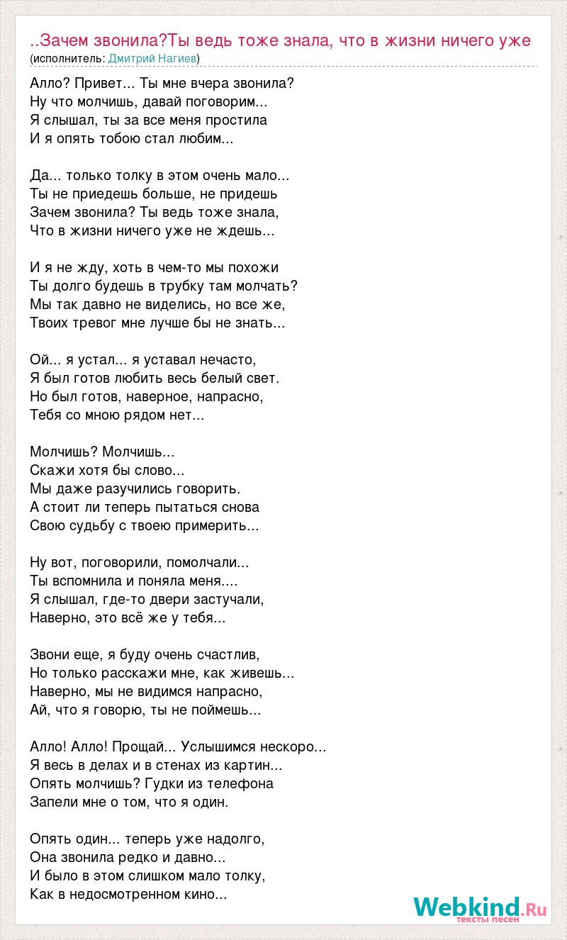 Главная→Исполнители→Дмитрий Нагиев→..Зачем звонила?Ты ведь тоже знала, что в жизни ничего уже не ждешь,..и
