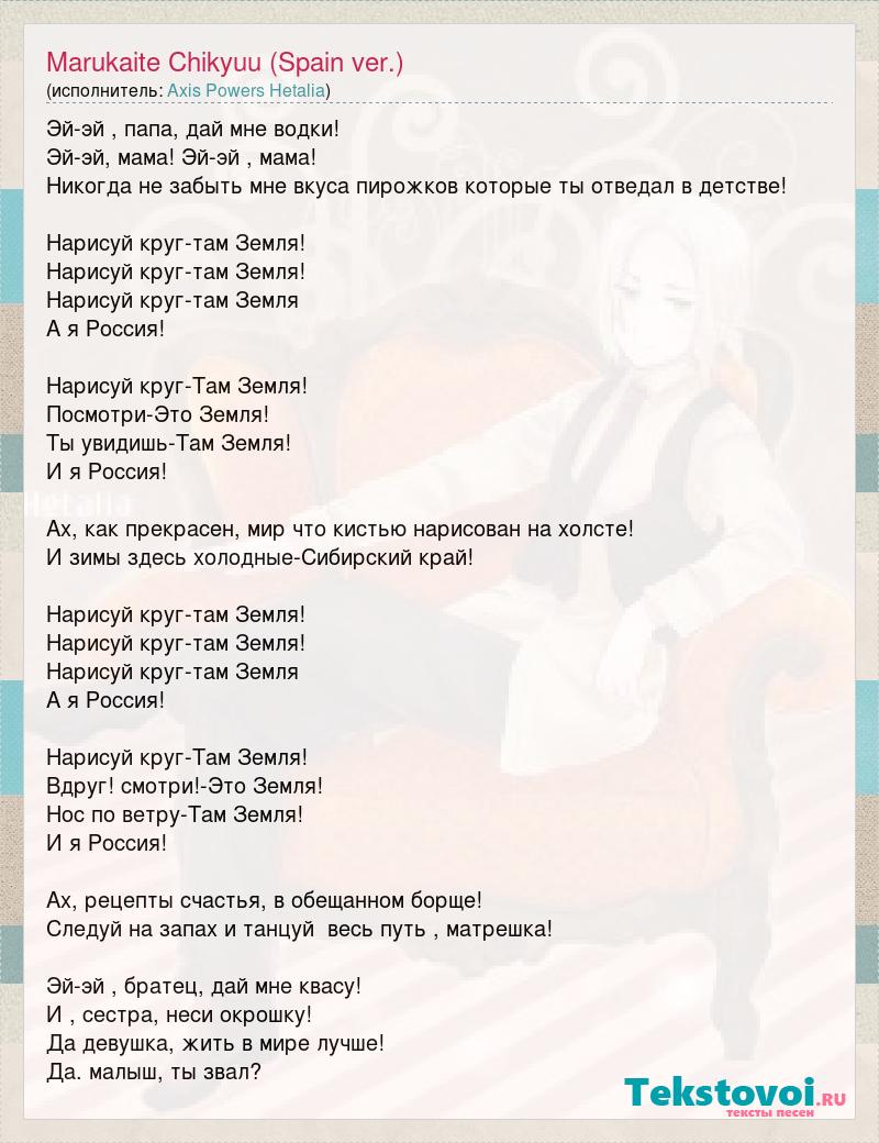 Эй-эй , папа, дай мне водки! Эй-эй, мама! Эй-эй , мама! Никогда не забыть мне вкуса пирожков которые ты отведал в детстве! Нарисуй круг-там Земля! Нарисуй круг-там Земля! Нарисуй круг-там Земля А я Россия! Нарисуй круг-Там Земля! Посмотри-Это Земля! Ты увидишь-Там Земля! И я Россия! Ах, как прекрасен, мир что кистью нарисован на холсте! И зимы здесь холодные-Сибирский край! Нарисуй круг-там Земля! Нарисуй круг-там Земля! Нарисуй круг-там Земля А я Россия! Нарисуй круг-Там Земля! Вдруг! смотри!-Это Земля! Нос по ветру-Там Земля! И я Россия! Ах, рецепты счастья, в обещанном борще! Следуй на запах и танцуй весь путь , матрешка! Эй-эй , братец, дай мне квасу! И , сестра, неси окрошку! Да девушка, жить в мире лучше! Да. малыш, ты звал?