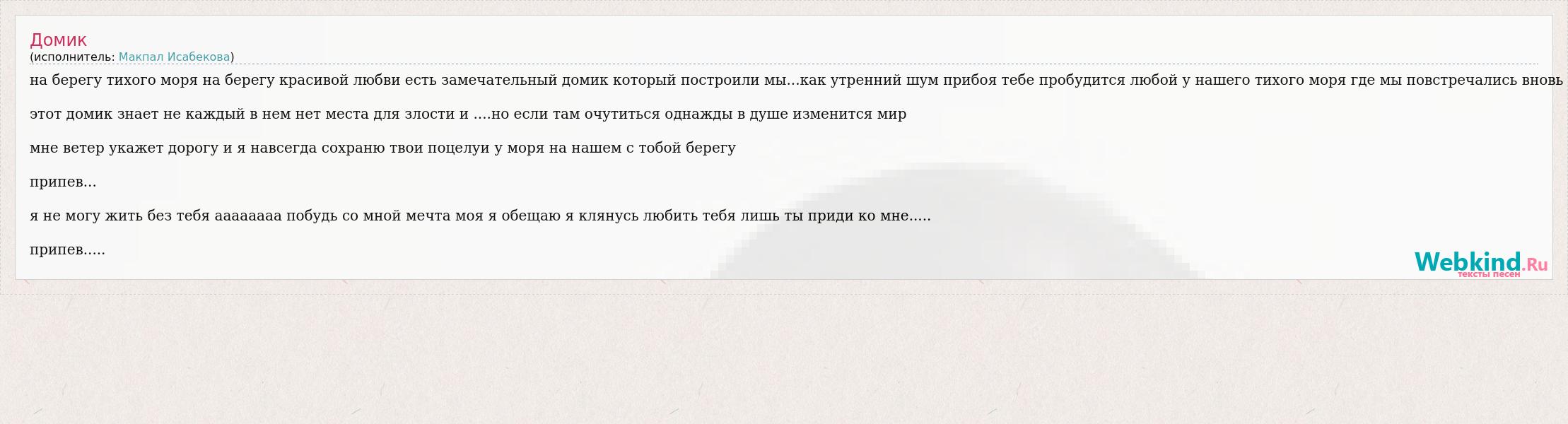 на берегу тихого моря на берегу красивой любви есть замечательный домик который построили мы...как утренний шум прибоя тебе пробудится любой у нашего тихого моря где мы повстречались вновь этот домик знает не каждый в нем нет места для злости и ....но если там очутиться однажды в душе изменится мир мне ветер укажет дорогу и я навсегда сохраню твои поцелуи у моря на нашем с тобой берегу припев... я не могу жить без тебя аааааааа побудь со мной мечта моя я обещаю я клянусь любить тебя лишь ты приди ко мне..... припев.....
