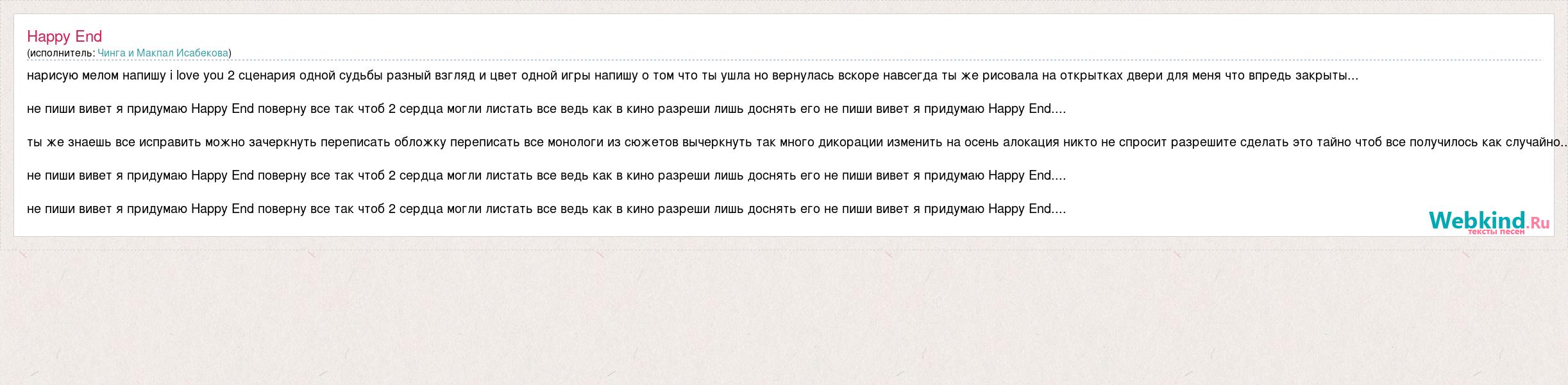 нарисую мелом напишу i love you 2 сценария одной судьбы разный взгляд и цвет одной игры напишу о том что ты ушла но вернулась вскоре навсегда ты же рисовала на открытках двери для меня что впредь закрыты... не пиши вивет я придумаю Happy End поверну все так чтоб 2 сердца могли листать все ведь как в кино разреши лишь доснять его не пиши вивет я придумаю Happy End.... ты же знаешь все исправить можно зачеркнуть переписать обложку переписать все монологи из сюжетов вычеркнуть так много дикорации изменить на осень алокация никто не спросит разрешите сделать это тайно чтоб все получилось как случайно.. не пиши вивет я придумаю Happy End поверну все так чтоб 2 сердца могли листать все ведь как в кино разреши лишь доснять его не пиши вивет я придумаю Happy End.... не пиши вивет я придумаю Happy End поверну все так чтоб 2 сердца могли листать все ведь как в кино разреши лишь доснять его не пиши вивет я придумаю Happy End....