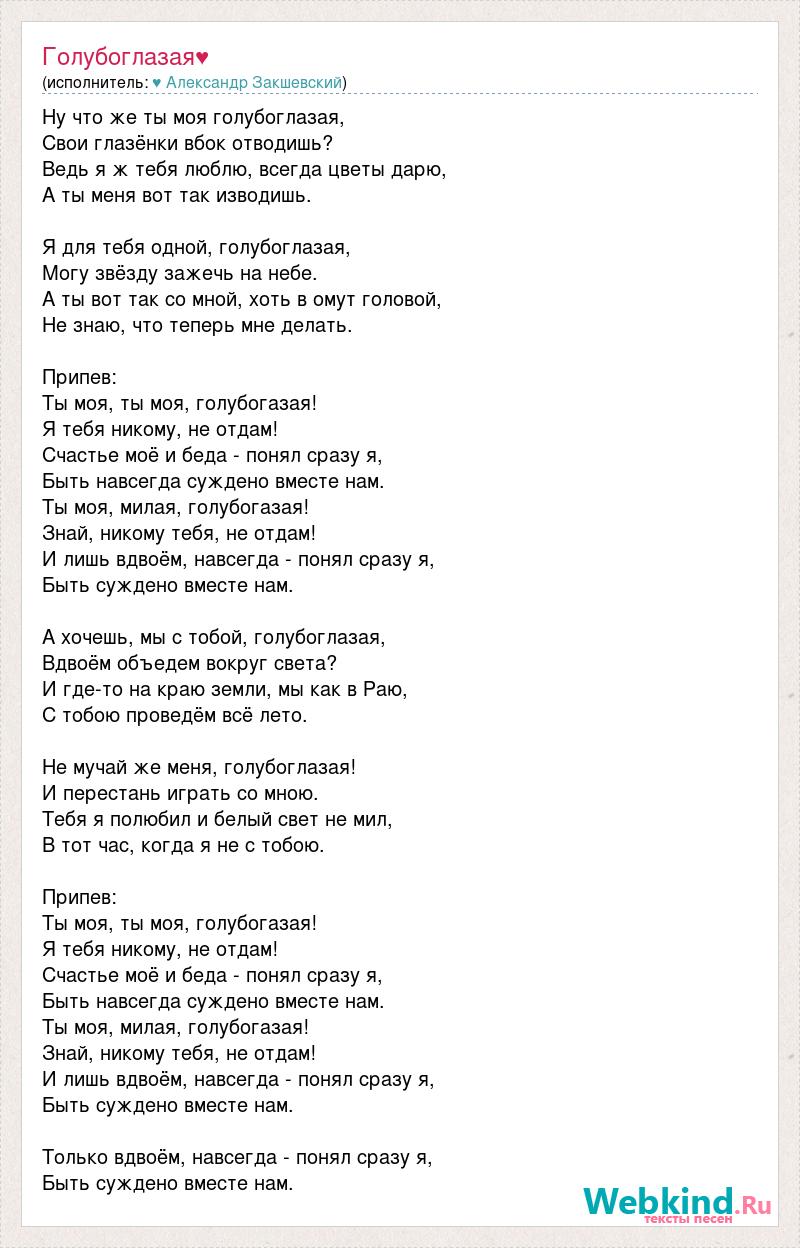Ну что же ты моя голубоглазая, Свои глазёнки вбок отводишь? Ведь я ж тебя люблю, всегда цветы дарю, А ты меня вот так изводишь. Я для тебя одной, голубоглазая, Могу звёзду зажечь на небе. А ты вот так со мной, хоть в омут головой, Не знаю, что теперь мне делать. Припев: Ты моя, ты моя, голубогазая! Я тебя никому, не отдам! Счастье моё и беда - понял сразу я, Быть навсегда суждено вместе нам. Ты моя, милая, голубогазая! Знай, никому тебя, не отдам! И лишь вдвоём, навсегда - понял сразу я, Быть суждено вместе нам. А хочешь, мы с тобой, голубоглазая, Вдвоём объедем вокруг света? И где-то на краю земли, мы как в Раю, С тобою проведём всё лето. Не мучай же меня, голубоглазая! И перестань играть со мною. Тебя я полюбил и белый свет не мил, В тот час, когда я не с тобою. Припев: Ты моя, ты моя, голубогазая! Я тебя никому, не отдам! Счастье моё и беда - понял сразу я, Быть навсегда суждено вместе нам. Ты моя, милая, голубогазая! Знай, никому тебя, не отдам! И лишь вдвоём, навсегда - понял сразу я, Быть суждено вместе нам. Только вдвоём, навсегда - понял сразу я, Быть суждено вместе нам.