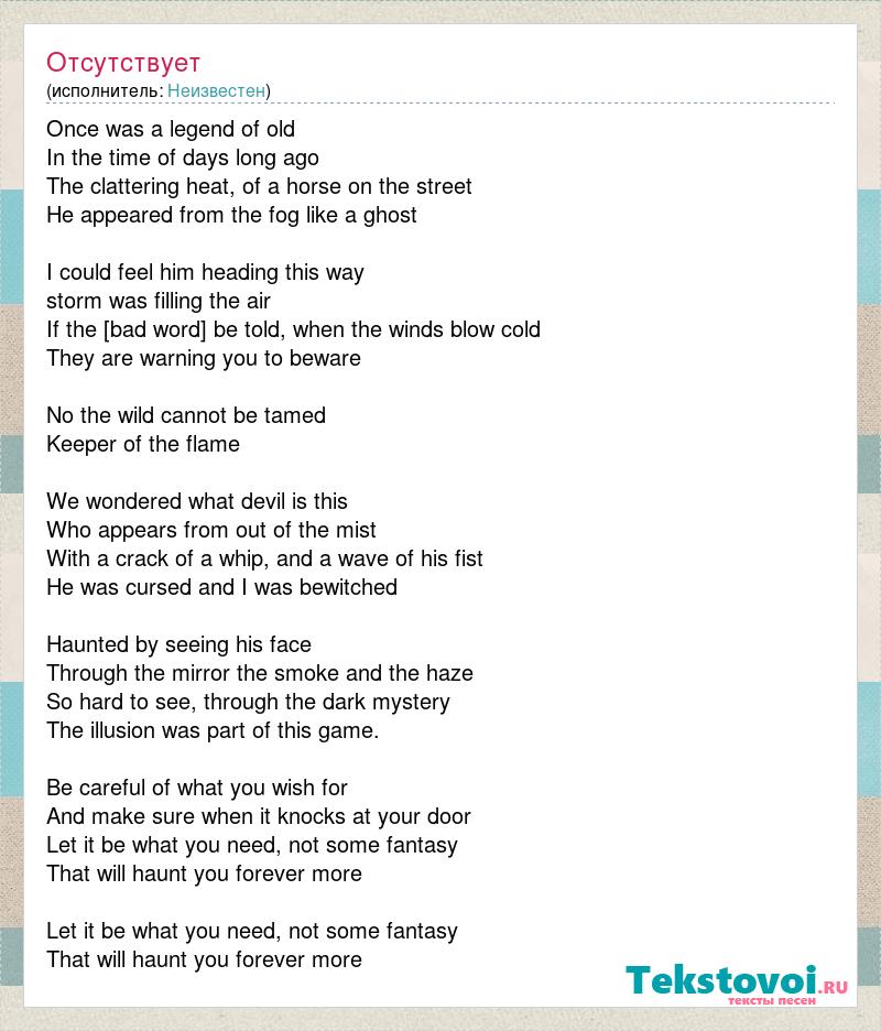 Once was a legend of old In the time of days long ago The clattering heat, of a horse on the street He appeared from the fog like a ghost I could feel him heading this way storm was filling the air If the truth be told, when the winds blow cold They are warning you to beware No the wild cannot be tamed Keeper of the flame We wondered what devil is this Who appears from out of the mist With a crack of a whip, and a wave of his fist He was cursed and I was bewitched Haunted by seeing his face Through the mirror the smoke and the haze So hard to see, through the dark mystery The illusion was part of this game. Be careful of what you wish for And make sure when it knocks at your door Let it be what you need, not some fantasy That will haunt you forever more Let it be what you need, not some fantasy That will haunt you forever more