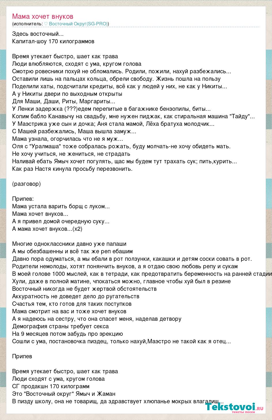Здесь восточный... Капитал-шоу 170 килограммов Время утекает быстро, шает как трава Люди влюбляются, сходят с ума, кругом голова Смотрю ровесники похуй не обломались. Родили, пожили, нахуй разбежались... Оставили лишь на пальцах кольца, обрели свободу. Жизнь пошла на пользу Поделили хаты, подсчитали кредиты, всё как у людей у них, не как у Никиты... А у Никиты двери по выходным открыты Для Маши, Даши, Риты, Маргариты... У Ленки задержка (???)едем перепитые в багажнике бензопилы, биты... Копим бабло Канавычу на свадьбу, мне нужен пиджак, как стиральная машина "Тайду"... У Маэстрика уже сын и дочка; Аня стала мамой, Лёха братуха молодчик... С Машей разбежались, Маша вышла замуж... Мама узнала, огорчилась что не я муж... Оля с "Уралмаша" тоже собралась рожать, буду молчать-не хочу обидеть мать. Не хочу учиться, не жениться, не страдать Наливай ебать Ямыч хочет погулять, щас мы будем тут трахать сук; пить,курить... Как раз Настя кинула просьбу перезвонить. (разговор) Припев: Мама устала варить борщ с луком... Мама хочет внуков... А я привел домой очередную суку... А мама хочет внуков...(х2) Многие одноклассники давно уже папаши А мы обезбашенны и всё так же реп ебашим Давно пора одуматься, а мы ебали в рот ползунки, какашки и детям соски совать в рот. Родители немолоды, хотят понянчить внуков, а я отдаю свою любовь репу и сукам В моей голове 1000 мыслей, как в тетради, как предотвратить беременность на ранней стадии Хули, даже в полной матине, чпокаться можно, главное чтобы хуй был в резине Восточный никогда не будет жертвой обстоятельств Аккуратность не доведет дело до ругательств Счастья тем, кто готов для таких поступков Мама смотрит на вас и тоже хочет внуков А я надеюсь на сестру, что она спасет меня, наделав детвору Демография страны требует секса На 9 месяцев потом забудь про эрекцию Сошли с ума, постановочка пиздец, только нахуй,Маэстро не такой как я отец... Припев Время утекает быстро, шает как трава Люди сходят с ума, кругом голова СГ продакшн 170 килограмм Это "Восточный округ" Ямыч и Жаман В пизду школу, она не товарищ, да здравствует хлюпанье мокрых влагалищ...