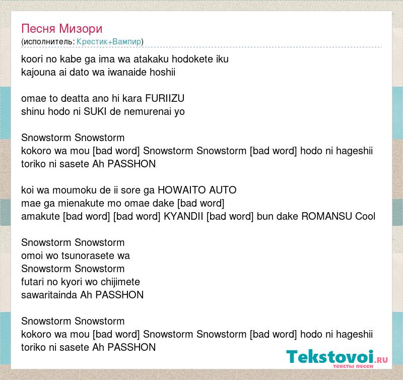 koori no kabe ga ima wa atakaku hodokete iku kajouna ai dato wa iwanaide hoshii omae to deatta ano hi kara FURIIZU shinu hodo ni SUKI de nemurenai yo Snowstorm Snowstorm kokoro wa mou [bad word] Snowstorm Snowstorm [bad word] hodo ni hageshii toriko ni sasete Ah PASSHON koi wa moumoku de ii sore ga HOWAITO AUTO mae ga mienakute mo omae dake [bad word] amakute [bad word] [bad word] KYANDII [bad word] bun dake ROMANSU Cool Snowstorm Snowstorm omoi wo tsunorasete wa Snowstorm Snowstorm futari no kyori wo chijimete sawaritainda Ah PASSHON Snowstorm Snowstorm kokoro wa mou [bad word] Snowstorm Snowstorm [bad word] hodo ni hageshii toriko ni sasete Ah PASSHON