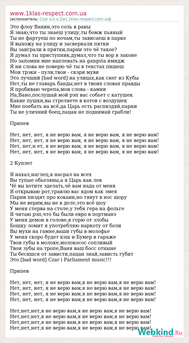 Это флоу Ванин,это соль в раны Я знаю,что ты знаеш улицу,ты бомж пьяный Ты не фартуеш по ночам,ты зависаеш в парке Я выхожу на улицу и засверкали пятки Вы заиграли в прятки,парни это чё такое? Я думал ты приступник,думал,что ты вор в законе Но запомни мне наплевать на gangsta имидж Я ни слова не поверю чё ты в текстах пишеш Мои трэки - пули,твои - скэри муви Это лучший [bad word] на улицах,как снег из Кубы Нет,ты не главарь банды,нет в твоих словах правды Я пробиваю черепа,мои слова - камни На,Вано,послушай мой рэп вас собьет с катушек Какие пушки,вы стреляете в котов с воздушек Мне поебать на всё,да Царь есть распиздяй,парни Ты не уличний боец,пацан не поднимай грабли! Припев Нет, нет, нет, я не верю вам, я не верю вам, я не верю вам! Нет, нет, нет, я не верю вам, я не верю вам, я не верю вам! Нет, нет,н ет, я не верю вам, я не верю вам, я не верю вам! Нет, нет, нет, я не верю вам, я не верю вам, я не верю вам! 2 Куплет Я нахал,наглец,я насрал на всех Вы тупые обьезяны,а я Царь как лев Чё вы хотите зделать,чё вам нада от меня Я открываю рот,травлю вас ядом как змея Парни пиздят про кокаин,но тянут в нос шору Мы не верим,вы не в деле,это всё шоу У меня стерва на столе,у тебя гера на фольге Я читаю рэп,что бы были евро в портманэ У меня демон в голове,я горю от злобы Бошку ломит я употребляю наркоту от боли Вы мухи на гамне,ваши губы в молофье У меня скоро будет кэш и Бумер в гараже Твои губы в молоке,молокосос сопливый Твои зубы на тропе,Ваня ваш босс отныне Ты бесишся от зависти,пацан знай,зависть губит Это [bad word] Czar i Parliament music!!! Припев Нет, нет, нет, я не верю вам,я не верю вам,я не верю вам! Нет, нет, нет, я не верю вам,я не верю вам,я не верю вам! Нет, нет, нет, я не верю вам,я не верю вам,я не верю вам! Нет, нет, нет, я не верю вам,я не верю вам,я не верю вам! Нет,нет,нет,я не верю вам,я не верю вам,я не верю вам! Нет,нет,нет,я не верю вам,я не верю вам,я не верю вам! Нет,нет,нет,я не верю вам,я не верю вам,я не верю вам! Нет,нет,нет,я не верю вам,я не верю вам,я не верю вам!