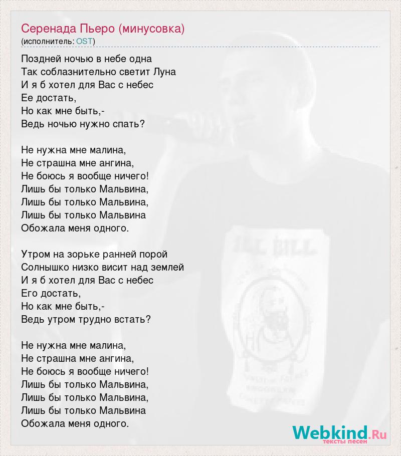 Поздней ночью в небе одна Так соблазнительно светит Луна И я б хотел для Вас с небес Ее достать, Но как мне быть,- Ведь ночью нужно спать? Не нужна мне малина, Не страшна мне ангина, Не боюсь я вообще ничего! Лишь бы только Мальвина, Лишь бы только Мальвина, Лишь бы только Мальвина Обожала меня одного. Утром на зорьке ранней порой Солнышко низко висит над землей И я б хотел для Вас с небес Его достать, Но как мне быть,- Ведь утром трудно встать? Не нужна мне малина, Не страшна мне ангина, Не боюсь я вообще ничего! Лишь бы только Мальвина, Лишь бы только Мальвина, Лишь бы только Мальвина Обожала меня одного.