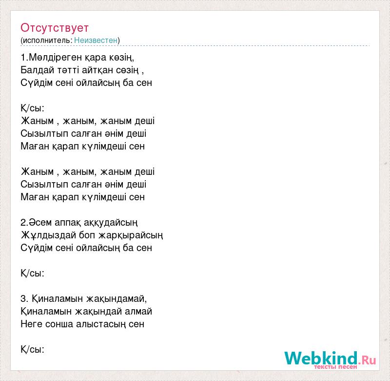 1.Мөлдіреген қара көзің, Балдай тәтті айтқан сөзің , Сүйдім сені ойлайсың ба сен Қ/сы: Жаным , жаным, жаным деші Сызылтып салған әнім деші Маған қарап күлімдеші сен Жаным , жаным, жаным деші Сызылтып салған әнім деші Маған қарап күлімдеші сен 2.Әсем аппақ аққудайсың Жұлдыздай боп жарқырайсың Сүйдім сені ойлайсың ба сен Қ/сы: 3. Қиналамын жақындамай, Қиналамын жақындай алмай Неге сонша алыстасың сен Қ/сы: