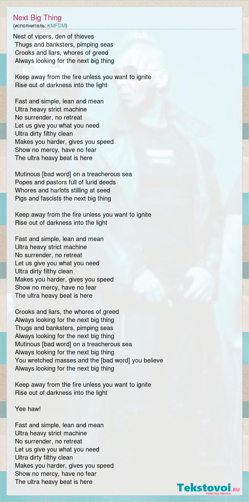 Nest of vipers, den of thieves Thugs and banksters, pimping seas Crooks and liars, whores of greed Always looking for the next big thing Keep away from the fire unless you want to ignite Rise out of darkness into the light Fast and simple, lean and mean Ultra heavy strict machine No surrender, no retreat Let us give you what you need Ultra dirty filthy clean Makes you harder, gives you speed Show no mercy, have no fear The ultra heavy beat is here Mutinous [bad word] on a treacherous sea Popes and pastors full of lurid deeds Whores and harlots stilling at seed Pigs and fascists the next big thing Keep away from the fire unless you want to ignite Rise out of darkness into the light Fast and simple, lean and mean Ultra heavy strict machine No surrender, no retreat Let us give you what you need Ultra dirty filthy clean Makes you harder, gives you speed Show no mercy, have no fear The ultra heavy beat is here Crooks and liars, the whores of greed Always looking for the next big thing Thugs and banksters, pimping seas Always looking for the next big thing Mutinous [bad word] on a treacherous sea Always looking for the next big thing You wretched masses and the [bad word] you believe Always looking for the next big thing Keep away from the fire unless you want to ignite Rise out of darkness into the light Yee haw! Fast and simple, lean and mean Ultra heavy strict machine No surrender, no retreat Let us give you what you need Ultra dirty filthy clean Makes you harder, gives you speed Show no mercy, have no fear The ultra heavy beat is here