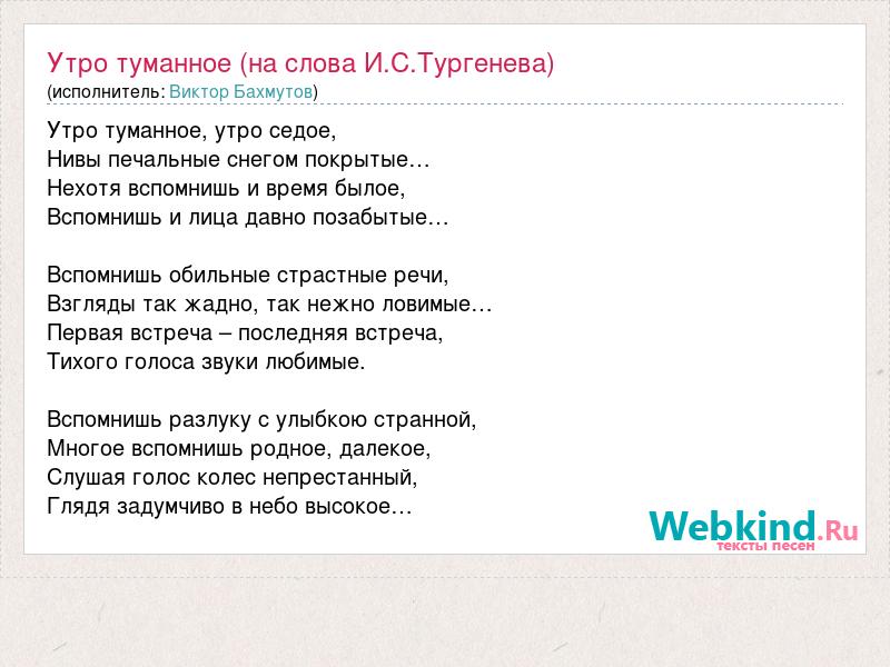Утро туманное, утро седое, Нивы печальные снегом покрытые… Нехотя вспомнишь и время былое, Вспомнишь и лица давно позабытые… Вспомнишь обильные страстные речи, Взгляды так жадно, так нежно ловимые… Первая встреча – последняя встреча, Тихого голоса звуки любимые. Вспомнишь разлуку с улыбкою странной, Многое вспомнишь родное, далекое, Слушая голос колес непрестанный, Глядя задумчиво в небо высокое…