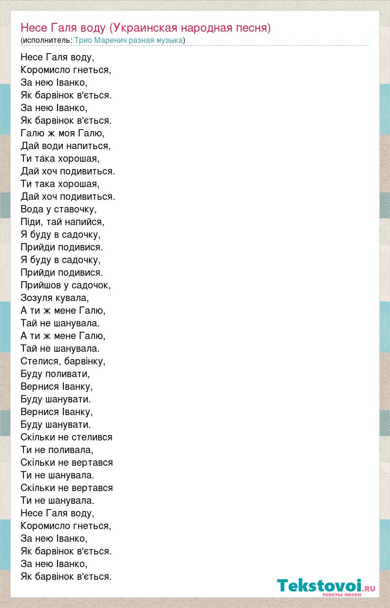 Несе Галя воду, Коромисло гнеться, За нею Іванко, Як барвінок в'ється. За нею Іванко, Як барвінок в'ється. Галю ж моя Галю, Дай води напиться, Ти така хорошая, Дай хоч подивиться. Ти така хорошая, Дай хоч подивиться. Вода у ставочку, Піди, тай напийся, Я буду в садочку, Прийди подивися. Я буду в садочку, Прийди подивися. Прийшов у садочок, Зозуля кувала, А ти ж мене Галю, Тай не шанувала. А ти ж мене Галю, Тай не шанувала. Стелися, барвінку, Буду поливати, Вернися Іванку, Буду шанувати. Вернися Іванку, Буду шанувати. Скільки не стелився Ти не поливала, Скільки не вертався Ти не шанувала. Скільки не вертався Ти не шанувала. Несе Галя воду, Коромисло гнеться, За нею Іванко, Як барвінок в'ється. За нею Іванко, Як барвінок в'ється.