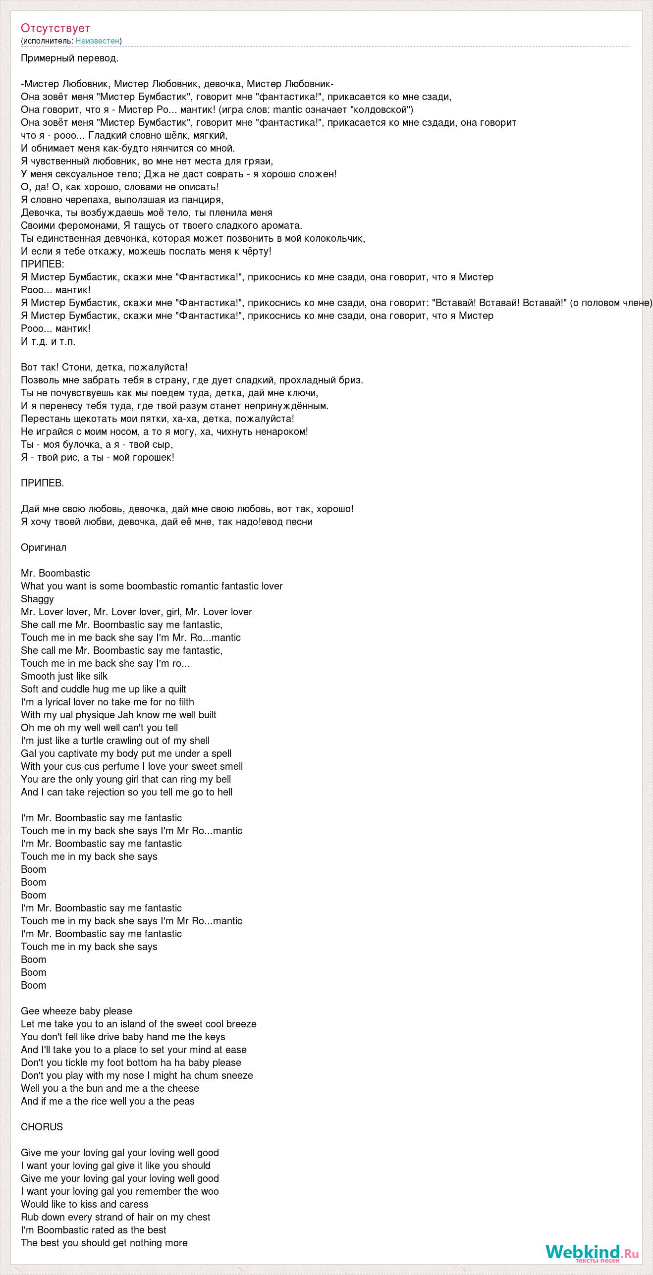 Примерный перевод. -Мистер Любовник, Мистер Любовник, девочка, Мистер Любовник- Она зовёт меня "Мистер Бумбастик", говорит мне "фантастика!", прикасается ко мне сзади, Она говорит, что я - Мистер Ро... мантик! (игра слов: mantic означает "колдовской") Она зовёт меня "Мистер Бумбастик", говорит мне "фантастика!", прикасается ко мне сздади, она говорит что я - рооо... Гладкий словно шёлк, мягкий, И обнимает меня как-будто нянчится со мной. Я чувственный любовник, во мне нет места для грязи, У меня сексуальное тело; Джа не даст соврать - я хорошо сложен! О, да! О, как хорошо, словами не описать! Я словно черепаха, выползшая из панциря, Девочка, ты возбуждаешь моё тело, ты пленила меня Своими феромонами, Я тащусь от твоего сладкого аромата. Ты единственная девчонка, которая может позвонить в мой колокольчик, И если я тебе откажу, можешь послать меня к чёрту! ПРИПЕВ: Я Мистер Бумбастик, скажи мне "Фантастика!", прикоснись ко мне сзади, она говорит, что я Мистер Рооо... мантик! Я Мистер Бумбастик, скажи мне "Фантастика!", прикоснись ко мне сзади, она говорит: "Вставай! Вставай! Вставай!" (о половом члене) Я Мистер Бумбастик, скажи мне "Фантастика!", прикоснись ко мне сзади, она говорит, что я Мистер Рооо... мантик! И т.д. и т.п. Вот так! Стони, детка, пожалуйста! Позволь мне забрать тебя в страну, где дует сладкий, прохладный бриз. Ты не почувствуешь как мы поедем туда, детка, дай мне ключи, И я перенесу тебя туда, где твой разум станет непринуждённым. Перестань щекотать мои пятки, ха-ха, детка, пожалуйста! Не играйся с моим носом, а то я могу, ха, чихнуть ненароком! Ты - моя булочка, а я - твой сыр, Я - твой рис, а ты - мой горошек! ПРИПЕВ. Дай мне свою любовь, девочка, дай мне свою любовь, вот так, хорошо! Я хочу твоей любви, девочка, дай её мне, так надо!евод песни Оригинал Mr. Boombastic What you want is some boombastic romantic fantastic lover Shaggy Mr. Lover lover, Mr. Lover lover, girl, Mr. Lover lover She call me Mr. Boombastic say me fantastic, Touch me in me back she say I'm Mr. Ro...mantic She call me Mr. Boombastic say me fantastic, Touch me in me back she say I'm ro... Smooth just like silk Soft and cuddle hug me up like a quilt I'm a lyrical lover no take me for no filth With my ual physique Jah know me well built Oh me oh my well well can't you tell I'm just like a turtle crawling out of my shell Gal you captivate my body put me under a spell With your cus cus perfume I love your sweet smell You are the only young girl that can ring my bell And I can take rejection so you tell me go to hell I'm Mr. Boombastic say me fantastic Touch me in my back she says I'm Mr Ro...mantic I'm Mr. Boombastic say me fantastic Touch me in my back she says Boom Boom Boom I'm Mr. Boombastic say me fantastic Touch me in my back she says I'm Mr Ro...mantic I'm Mr. Boombastic say me fantastic Touch me in my back she says Boom Boom Boom Gee wheeze baby please Let me take you to an island of the sweet cool breeze You don't fell like drive baby hand me the keys And I'll take you to a place to set your mind at ease Don't you tickle my foot bottom ha ha baby please Don't you play with my nose I might ha chum sneeze Well you a the bun and me a the cheese And if me a the rice well you a the peas CHORUS Give me your loving gal your loving well good I want your loving gal give it like you should Give me your loving gal your loving well good I want your loving gal you remember the woo Would like to kiss and caress Rub down every strand of hair on my chest I'm Boombastic rated as the best The best you should get nothing more