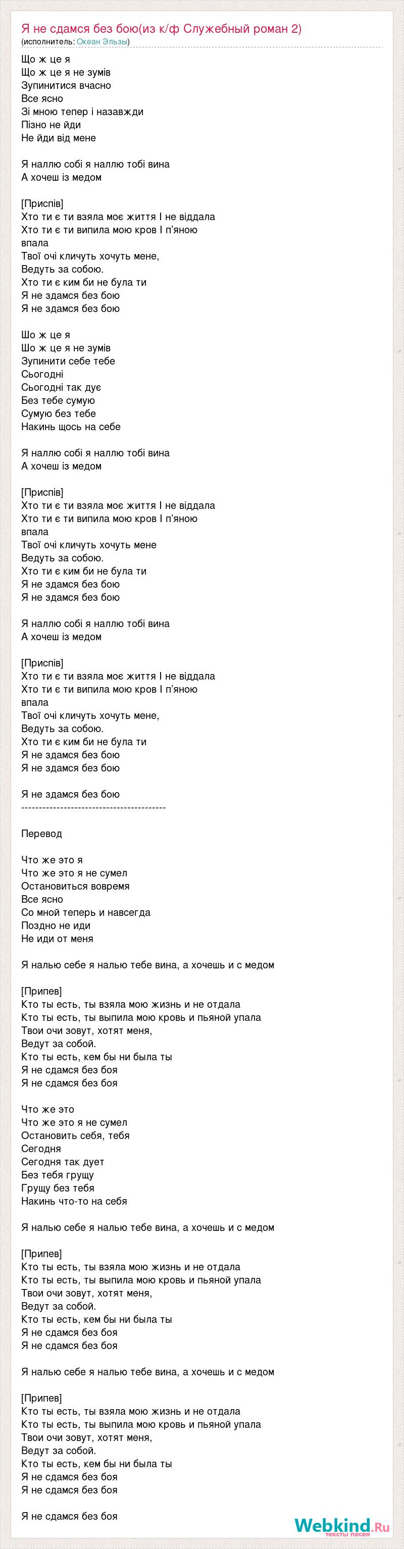 Що ж це я Що ж це я не зумів Зупинитися вчасно Все ясно Зі мною тепер і назавжди Пізно не йди Не йди від мене Я наллю собі я наллю тобі вина А хочеш із медом [Приспів] Хто ти є ти взяла моє життя І не віддала Хто ти є ти випила мою кров І п’яною впала Твої очі кличуть хочуть мене, Ведуть за собою. Хто ти є ким би не була ти Я не здамся без бою Я не здамся без бою Шо ж це я Шо ж це я не зумів Зупинити себе тебе Сьогодні Сьогодні так дує Без тебе сумую Сумую без тебе Накинь щось на себе Я наллю собі я наллю тобі вина А хочеш із медом [Приспів] Хто ти є ти взяла моє життя І не віддала Хто ти є ти випила мою кров І п’яною впала Твої очі кличуть хочуть мене Ведуть за собою. Хто ти є ким би не була ти Я не здамся без бою Я не здамся без бою Я наллю собі я наллю тобі вина А хочеш із медом [Приспів] Хто ти є ти взяла моє життя І не віддала Хто ти є ти випила мою кров І п’яною впала Твої очі кличуть хочуть мене, Ведуть за собою. Хто ти є ким би не була ти Я не здамся без бою Я не здамся без бою Я не здамся без бою ----------------------------------------- Перевод Что же это я Что же это я не сумел Остановиться вовремя Все ясно Со мной теперь и навсегда Поздно не иди Не иди от меня Я налью себе я налью тебе вина, а хочешь и с медом [Припев] Кто ты есть, ты взяла мою жизнь и не отдала Кто ты есть, ты выпила мою кровь и пьяной упала Твои очи зовут, хотят меня, Ведут за собой. Кто ты есть, кем бы ни была ты Я не сдамся без боя Я не сдамся без боя Что же это Что же это я не сумел Остановить себя, тебя Сегодня Сегодня так дует Без тебя грущу Грущу без тебя Накинь что-то на себя Я налью себе я налью тебе вина, а хочешь и с медом [Припев] Кто ты есть, ты взяла мою жизнь и не отдала Кто ты есть, ты выпила мою кровь и пьяной упала Твои очи зовут, хотят меня, Ведут за собой. Кто ты есть, кем бы ни была ты Я не сдамся без боя Я не сдамся без боя Я налью себе я налью тебе вина, а хочешь и с медом [Припев] Кто ты есть, ты взяла мою жизнь и не отдала Кто ты есть, ты выпила мою кровь и пьяной упала Твои очи зовут, хотят меня, Ведут за собой. Кто ты есть, кем бы ни была ты Я не сдамся без боя Я не сдамся без боя Я не сдамся без боя