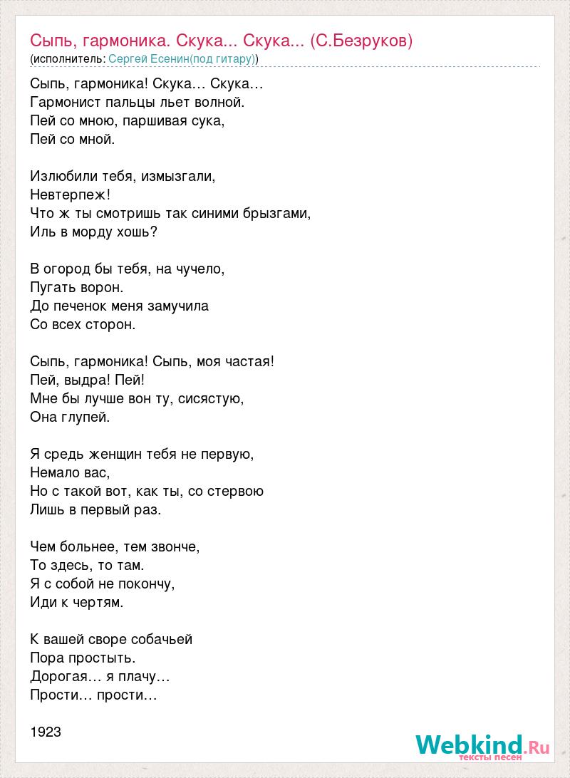 Сыпь, гармоника! Скука… Скука… Гармонист пальцы льет волной. Пей со мною, паршивая сука, Пей со мной. Излюбили тебя, измызгали, Невтерпеж! Что ж ты смотришь так синими брызгами, Иль в морду хошь? В огород бы тебя, на чучело, Пугать ворон. До печенок меня замучила Со всех сторон. Сыпь, гармоника! Сыпь, моя частая! Пей, выдра! Пей! Мне бы лучше вон ту, сисястую, Она глупей. Я средь женщин тебя не первую, Немало вас, Но с такой вот, как ты, со стервою Лишь в первый раз. Чем больнее, тем звонче, То здесь, то там. Я с собой не покончу, Иди к чертям. К вашей своре собачьей Пора простыть. Дорогая… я плачу… Прости… прости… 1923