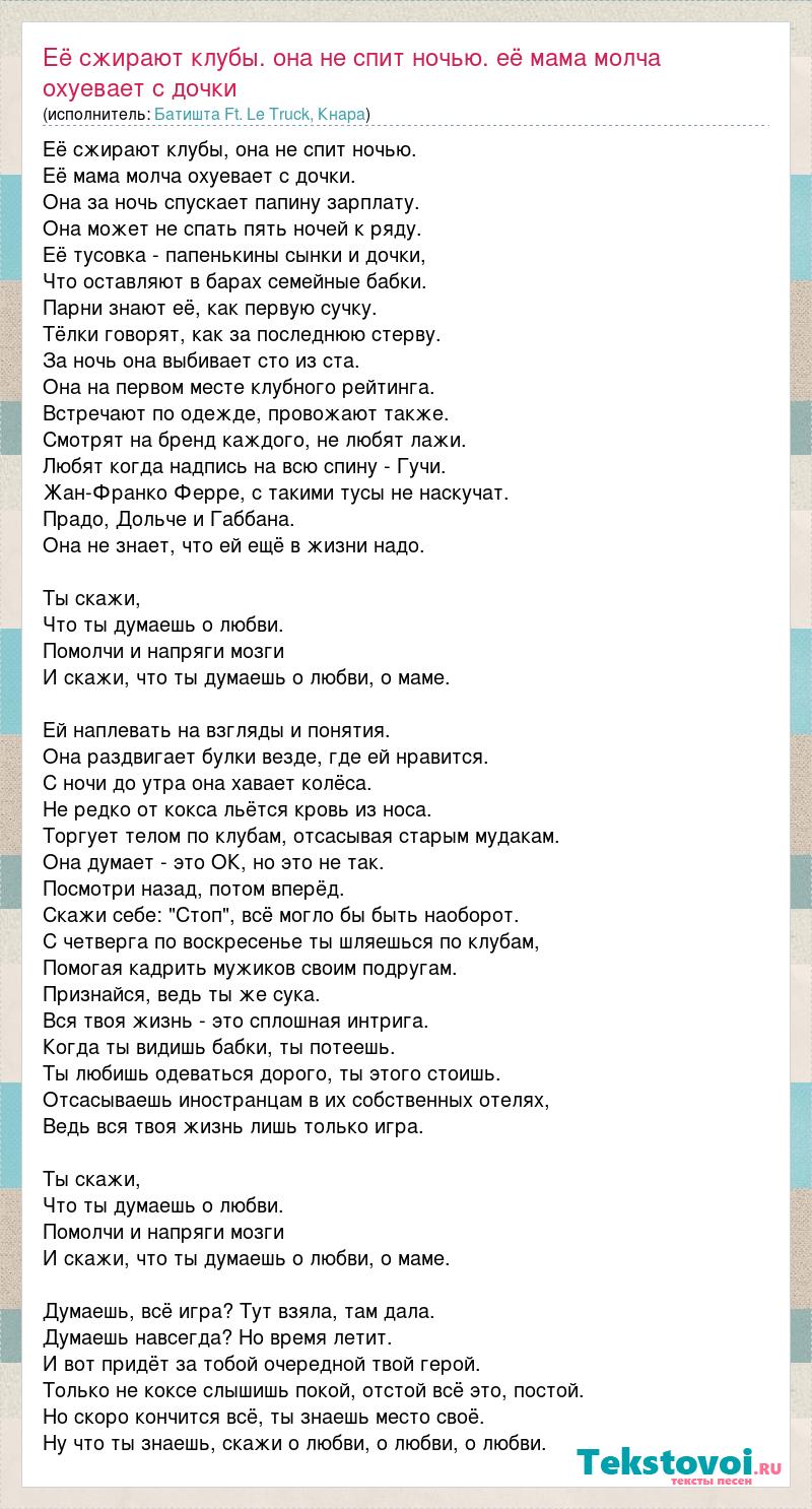 Главная→Исполнители→Батишта Ft. Le Truck, Кнара→Её сжирают клубы. она не спит ночью. её мама молча охуевает с дочки