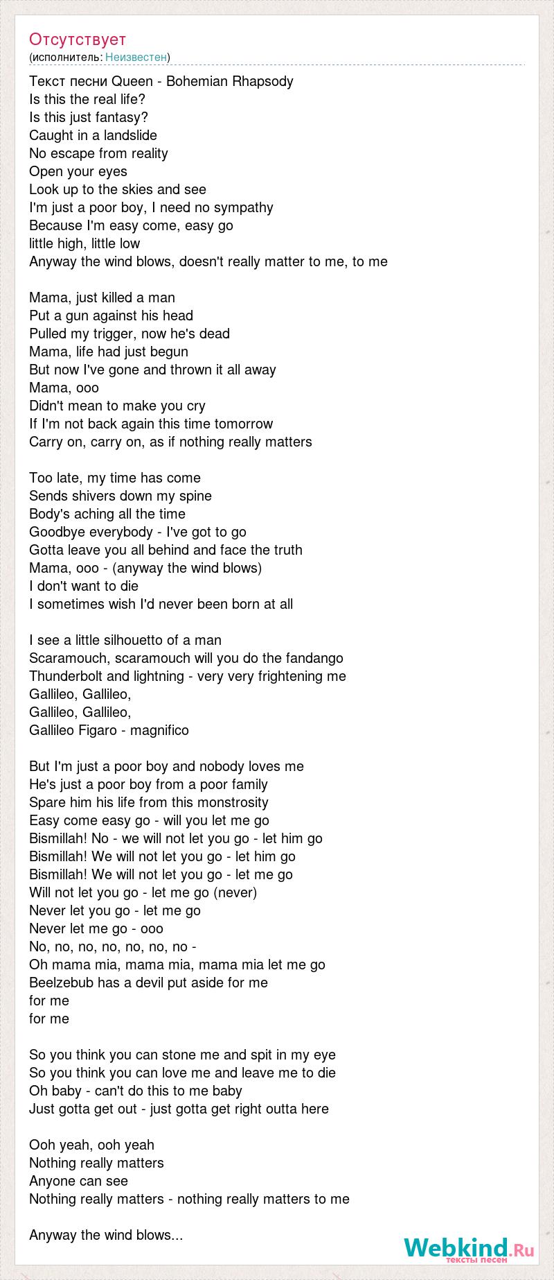 Текст песни Queen - Bohemian Rhapsody Is this the real life? Is this just fantasy? Caught in a landslide No escape from reality Open your eyes Look up to the skies and see I'm just a poor boy, I need no sympathy Because I'm easy come, easy go little high, little low Anyway the wind blows, doesn't really matter to me, to me Mama, just killed a man Put a gun against his head Pulled my trigger, now he's dead Mama, life had just begun But now I've gone and thrown it all away Mama, ooo Didn't mean to make you cry If I'm not back again this time tomorrow Carry on, carry on, as if nothing really matters Too late, my time has come Sends shivers down my spine Body's aching all the time Goodbye everybody - I've got to go Gotta leave you all behind and face the truth Mama, ooo - (anyway the wind blows) I don't want to die I sometimes wish I'd never been born at all I see a little silhouetto of a man Scaramouch, scaramouch will you do the fandango Thunderbolt and lightning - very very frightening me Gallileo, Gallileo, Gallileo, Gallileo, Gallileo Figaro - magnifico But I'm just a poor boy and nobody loves me He's just a poor boy from a poor family Spare him his life from this monstrosity Easy come easy go - will you let me go Bismillah! No - we will not let you go - let him go Bismillah! We will not let you go - let him go Bismillah! We will not let you go - let me go Will not let you go - let me go (never) Never let you go - let me go Never let me go - ooo No, no, no, no, no, no, no - Oh mama mia, mama mia, mama mia let me go Beelzebub has a devil put aside for me for me for me So you think you can stone me and spit in my eye So you think you can love me and leave me to die Oh baby - can't do this to me baby Just gotta get out - just gotta get right outta here Ooh yeah, ooh yeah Nothing really matters Anyone can see Nothing really matters - nothing really matters to me Anyway the wind blows...