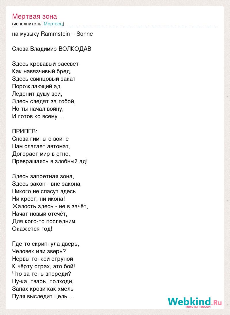 на музыку Rammstein – Sonne Слова Владимир ВОЛКОДАВ Здесь кровавый рассвет Как навязчивый бред, Здесь свинцовый закат Порождающий ад. Леденит душу вой, Здесь следят за тобой, Но ты начал войну, И готов ко всему ... ПРИПЕВ: Снова гимны о войне Нам слагает автомат, Догорает мир в огне, Превращаясь в злобный ад! Здесь запретная зона, Здесь закон - вне закона, Никого не спасут здесь Ни крест, ни икона! Жалость здесь - не в зачёт, Начат новый отсчёт, Для кого-то последним Окажется год! Где-то скрипнула дверь, Человек или зверь? Нервы тонкой струной К чёрту страх, это бой! Что за тень впереди? Ну-ка, тварь, подходи, Запах крови как хмель Пуля выследит цель ...