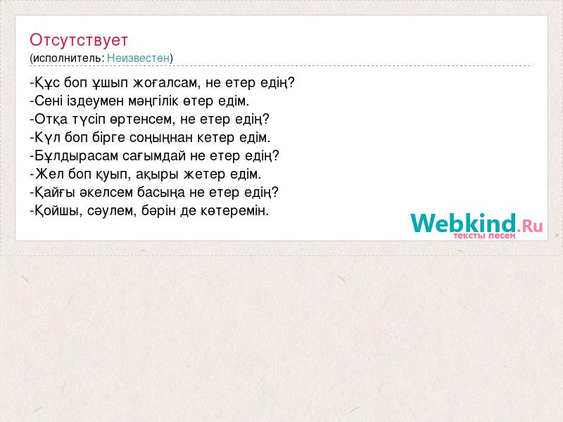 -Құс боп ұшып жоғалсам, не етер едің? -Сені іздеумен мәңгілік өтер едім. -Отқа түсіп өртенсем, не етер едің? -Күл боп бірге соңыңнан кетер едім. -Бұлдырасам сағымдай не етер едің? -Жел боп қуып, ақыры жетер едім. -Қайғы әкелсем басыңа не етер едің? -Қойшы, сәулем, бәрін де көтеремін.