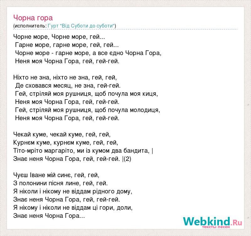 Чорне море, Чорне море, гей... Гарне море, гарне море, гей, гей... Чорне море - гарне море, а все єдно Чорна Гора, Неня моя Чорна Гора, гей, гей-гей. Ніхто не зна, ніхто не зна, гей, гей, Де сховався месяц, не зна, гей-гей. Гей, стріляй моя рушниця, щоб почула моя киця, Неня моя Чорна Гора, гей, гей-гей. Гей, стріляй моя рушниця, щоб почула молодиця, Неня моя Чорна Гора, гей, гей-гей. Чекай куме, чекай куме, гей, гей, Курнєм куме, курнєм куме, гей, гей, Тіто-мріто маргаріто, ми із кумом два бандита, | Знає неня Чорна Гора, гей, гей-гей. |(2) Чуєш Іване мій синє, гей, гей, З полонини пісня лине, гей, гей. Я ніколи і нікому не віддам рідного дому, Знає неня Чорна Гора, гей, гей-гей. Я нікому і ніколи не віддам ці гори, доли, Знає неня Чорна Гора...