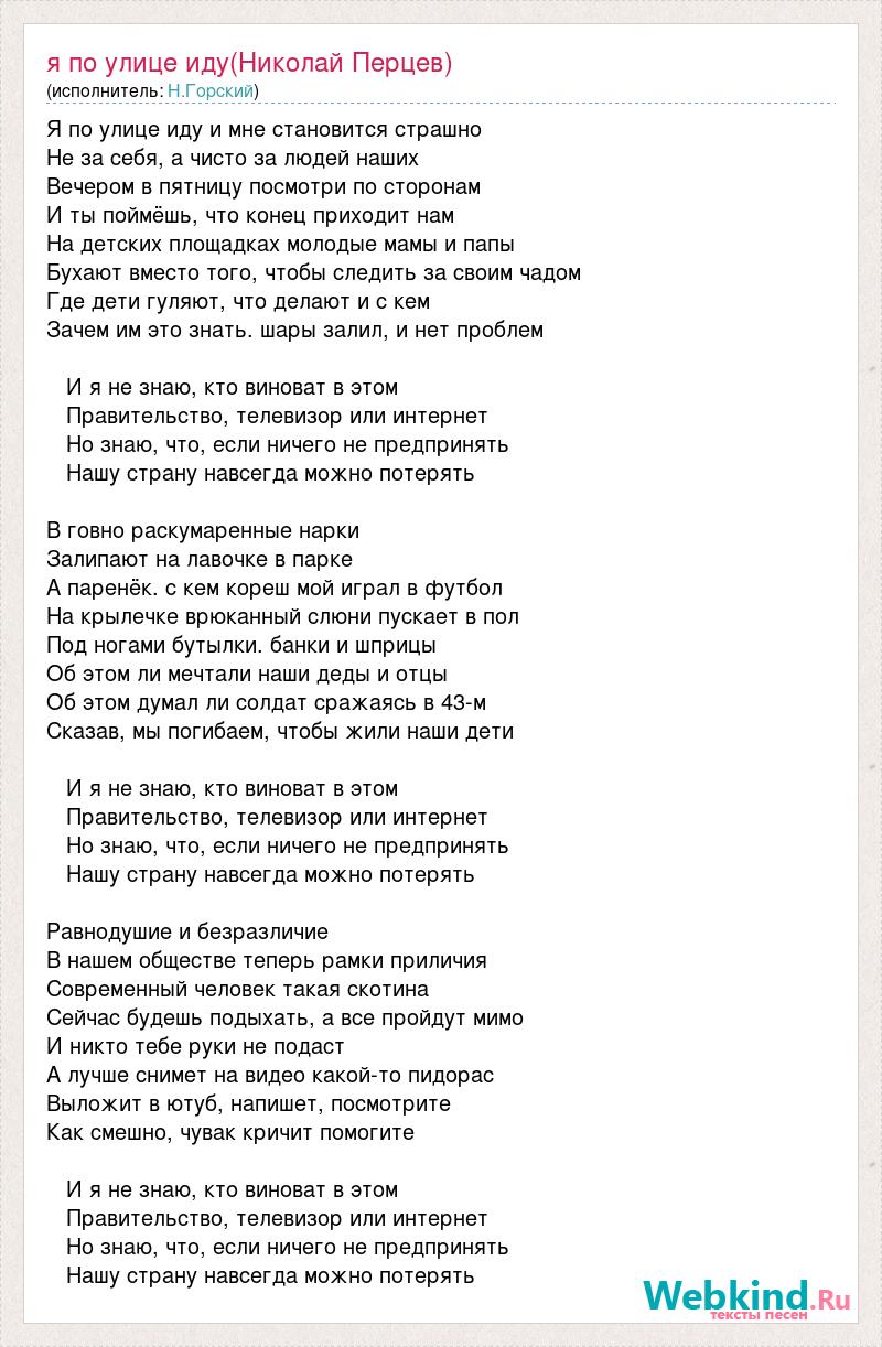 Я по улице иду и мне становится страшно Не за себя, а чисто за людей наших Вечером в пятницу посмотри по сторонам И ты поймёшь, что конец приходит нам На детских площадках молодые мамы и папы Бухают вместо того, чтобы следить за своим чадом Где дети гуляют, что делают и с кем Зачем им это знать. шары залил, и нет проблем И я не знаю, кто виноват в этом Правительство, телевизор или интернет Но знаю, что, если ничего не предпринять Нашу страну навсегда можно потерять В говно раскумаренные нарки Залипают на лавочке в парке А паренёк. с кем кореш мой играл в футбол На крылечке врюканный слюни пускает в пол Под ногами бутылки. банки и шприцы Об этом ли мечтали наши деды и отцы Об этом думал ли солдат сражаясь в 43-м Сказав, мы погибаем, чтобы жили наши дети И я не знаю, кто виноват в этом Правительство, телевизор или интернет Но знаю, что, если ничего не предпринять Нашу страну навсегда можно потерять Равнодушие и безразличие В нашем обществе теперь рамки приличия Современный человек такая скотина Сейчас будешь подыхать, а все пройдут мимо И никто тебе руки не подаст А лучше снимет на видео какой-то пидорас Выложит в ютуб, напишет, посмотрите Как смешно, чувак кричит помогите И я не знаю, кто виноват в этом Правительство, телевизор или интернет Но знаю, что, если ничего не предпринять Нашу страну навсегда можно потерять