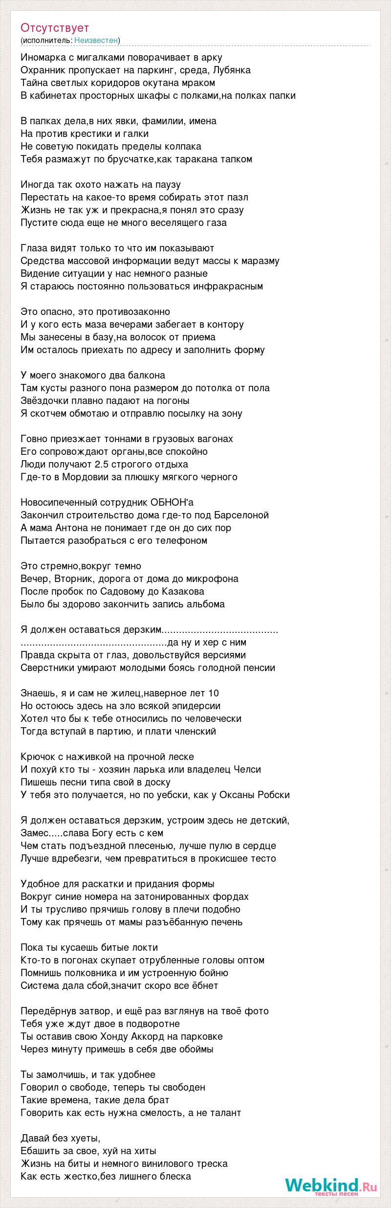 Иномарка с мигалками поворачивает в арку Охранник пропускает на паркинг, среда, Лубянка Тайна светлых коридоров окутана мраком В кабинетах просторных шкафы с полками,на полках папки В папках дела,в них явки, фамилии, имена На против крестики и галки Не советую покидать пределы колпака Тебя размажут по брусчатке,как таракана тапком Иногда так охото нажать на паузу Перестать на какое-то время собирать этот пазл Жизнь не так уж и прекрасна,я понял это сразу Пустите сюда еще не много веселящего газа Глаза видят только то что им показывают Средства массовой информации ведут массы к маразму Видение ситуации у нас немного разные Я стараюсь постоянно пользоваться инфракрасным Это опасно, это противозаконно И у кого есть маза вечерами забегает в контору Мы занесены в базу,на волосок от приема Им осталось приехать по адресу и заполнить форму У моего знакомого два балкона Там кусты разного пона размером до потолка от пола Звёздочки плавно падают на погоны Я скотчем обмотаю и отправлю посылку на зону Говно приезжает тоннами в грузовых вагонах Его сопровождают органы,все спокойно Люди получают 2.5 строгого отдыха Где-то в Мордовии за плюшку мягкого черного Новосипеченный сотрудник ОБНОН'а Закончил строительство дома где-то под Барселоной А мама Антона не понимает где он до сих пор Пытается разобраться с его телефоном Это стремно,вокруг темно Вечер, Вторник, дорога от дома до микрофона После пробок по Садовому до Казакова Было бы здорово закончить запись альбома Я должен оставаться дерзким........................................ ..................................................да ну и хер с ним Правда скрыта от глаз, довольствуйся версиями Сверстники умирают молодыми боясь голодной пенсии Знаешь, я и сам не жилец,наверное лет 10 Но остоюсь здесь на зло всякой эпидерсии Хотел что бы к тебе относились по человечески Тогда вступай в партию, и плати членский Крючок с наживкой на прочной леске И похуй кто ты - хозяин ларька или владелец Челси Пишешь песни типа свой в доску У тебя это получается, но по уебски, как у Оксаны Робски Я должен оставаться дерзким, устроим здесь не детский, Замес.....слава Богу есть с кем Чем стать подъездной плесенью, лучше пулю в сердце Лучше вдребезги, чем превратиться в прокисшее тесто Удобное для раскатки и придания формы Вокруг синие номера на затонированных фордах И ты трусливо прячишь голову в плечи подобно Тому как прячешь от мамы разъёбанную печень Пока ты кусаешь битые локти Кто-то в погонах скупает отрубленные головы оптом Помнишь полковника и им устроенную бойню Система дала сбой,значит скоро все ёбнет Передёрнув затвор, и ещё раз взглянув на твоё фото Тебя уже ждут двое в подворотне Ты оставив свою Хонду Аккорд на парковке Через минуту примешь в себя две обоймы Ты замолчишь, и так удобнее Говорил о свободе, теперь ты свободен Такие времена, такие дела брат Говорить как есть нужна смелость, а не талант Давай без хуеты, Ебашить за свое, хуй на хиты Жизнь на биты и немного винилового треска Как есть жестко,без лишнего блеска