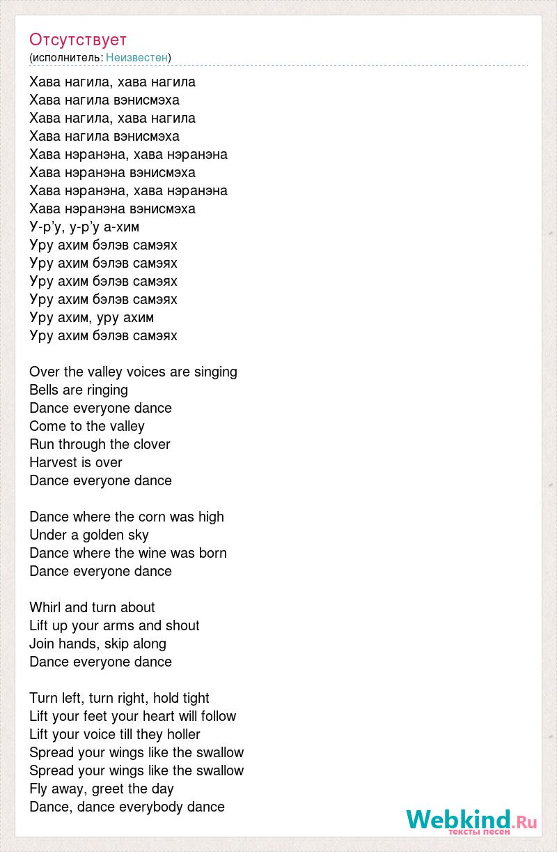Хава нагила, хава нагила Хава нагила вэнисмэха Хава нагила, хава нагила Хава нагила вэнисмэха Хава нэранэна, хава нэранэна Хава нэранэна вэнисмэха Хава нэранэна, хава нэранэна Хава нэранэна вэнисмэха У-р’у, у-р’у а-хим Уру ахим бэлэв самэях Уру ахим бэлэв самэях Уру ахим бэлэв самэях Уру ахим бэлэв самэях Уру ахим, уру ахим Уру ахим бэлэв самэях Over the valley voices are singing Bells are ringing Dance everyone dance Come to the valley Run through the clover Harvest is over Dance everyone dance Dance where the corn was high Under a golden sky Dance where the wine was born Dance everyone dance Whirl and turn about Lift up your arms and shout Join hands, skip along Dance everyone dance Turn left, turn right, hold tight Lift your feet your heart will follow Lift your voice till they holler Spread your wings like the swallow Spread your wings like the swallow Fly away, greet the day Dance, dance everybody dance